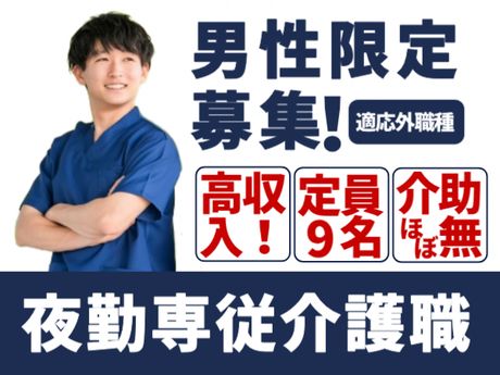 資格 ■介護福祉士 ■介護福祉士実務者研修(ヘルパー1級) ■介護職員初任者研修(ヘルパー2級) ※高齢者施設などでの夜勤経験 <ご希望の働き方をご相談ください> しっかり稼ぎたいなら!夜勤のお仕事☆ 介護施設で働く介護スタッフ(介護職員)募集♪ ■男性限定募集(適応外職種) ■男性入浴の見守りや更衣介助があるため適応除外、本求人では男性の方に限定して募集しています ■介護士の資格をお持ちの方、歓迎! ■長期歓迎!ブランクOK! / この求人は、 人材派遣・職業紹介会社【株式会社エタンセル】 が募集している求人です♪ \ 関西圏を中心に介護職・ヘルパー・ケアマネジャー・看護職など、医療・介護・福祉に特化したお仕事のご紹介が可能です。 <他にもいろんなお仕事をご用意♪> ■未経験OKのお仕事 ■平日のみ・土日祝休みや長期休暇ありのお仕事 ■高収入・高時給のお仕事 ■日勤のみのお仕事 ■短時間・時短のお仕事 ■夜間・深夜・夜勤専従のお仕事 ■残業なし・学歴不問・正社員登用・急募のお仕事 ■主婦・主夫が活躍できるお仕事 ■60歳以上のシニアさん歓迎のお仕事 など 性別の条件と理由:男性限定(風紀上)
