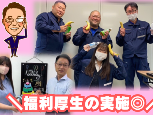 【保険制度】 雇用保険、労災保険、健康保険、厚生年金 福利厚生 雇用保険 / 労災保険 / 厚生年金 / 健康保険 / 交通費支給あり / 資格取得支援・手当あり / 育児支援・託児所あり ・子供扶養手当 ・社員の誕生日に現金贈呈(配偶者の誕生日にお米贈呈) ・社内懇親会 ・社長賞(報奨金) ・定期健康診断 ・インフルエンザ予防接種 ・ストレスチェック診断 ・女子トイレ完備 ・旅行同好会有 ・遊園地(夢の国)補助券有 ・交通費規定内支呈 ・制服貸与 ・マスク配布 ・新人紹介制度(1人紹介につき7.3万円) ・資格取得支援制度 ・マイカー通勤可能 ・試用期間3ヶ月(給与変動なし) など