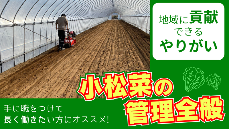 仕事内容 ╭━━━━━━━━━━╮ ✨ 新事業、始動中! ╰v━━━━━━━━━╯ 自然豊かなかすみがうら市で、 葉物野菜(主に小松菜・ほうれん草)を育てる 新しい農業プロジェクトがスタート! ハウスでの栽培体制も整い、 これからさらに規模を広げていく段階。 その中心となって活躍してくれる 新しい仲間を募集します。 ▍お任せするのは  ̄ ̄ ̄ ̄ ̄ ̄ ̄ ̄ ̄ 葉物野菜の栽培~出荷までの業務全般。 ✓ 栽培管理 ✓ 温度・湿度・水やり・肥料の調整 ✓ 病害虫対策 ✓ 収穫、選別 ✓ 出荷準備、配送 など 経験に応じて、 管理業務やリーダーポジションを お任せすることも可能です。 分からないことは先輩が丁寧に教えるので、 新しい環境でも安心して始められます◎ ╭━━━━━━━━━━╮ ⭐ この仕事の魅力! ╰v━━━━━━━━━╯ ★ 建設事業で実績を持つ会社が母体 ★ 新事業のためポジションのチャンスが豊富 ★ 経験を活かして裁量大きく働ける ★ 地域に貢献できるやりがいある仕事 安定基盤のもと、 腰を据えて農業に取り組める環境です。