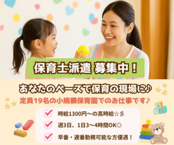 仕事内容 0~5歳児を対象とした保育業務全般をお任せします。 定員19名と少人数のため、一人ひとりに丁寧に関わることができます。 ・登園・降園対応 ・日々の遊び・生活支援 ・保護者対応 ・行事準備(最小限) ・外部講師と連携した活動支援(リトミック・英語) ※早番(7:00~)または遅番(~20:00)対応が可能な方を歓迎します。 ※詳細は面談時にご説明いたします。 ここがポイント! ・定員19名のアットホームな園で、子どもたちとじっくり関われます! ・残業・持ち帰りなし。行事も最小限で、業務効率を重視しています。 ・週3日~勤務OKで、ワークライフバランスも◎ ・英語・リトミックなど感性を育むカリキュラムを導入(外部講師担当) ・ブランクがあっても安心!先輩のサポート体制あり 【一言メッセージ】 職員みんなが「ここで働いてよかった」と思える職場づくりを心がけています。 保育の“やりがい”を大切にしながら、自分の時間も大切に。 まずは見学だけでもOKです。お気軽にご応募・お問い合わせください! 【安心のサポート体制】 当社の担当スタッフは、元保育士。 現場の気持ちを理解した上で、あなたの不安や悩みに寄り添いながらサポートします。 「どんな園が合っているか分からない」「ブランクがあるけど大丈夫?」 そんなご相談も大歓迎です。一度、お気軽にご相談ください!