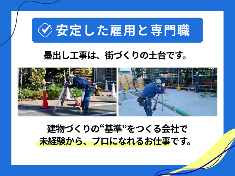 仕事内容 【建物の「基準」をつくる、力仕事がほぼない専門職!】 ビル建設工事現場にて、図面の寸法通りに現場の床や壁に”しるし”をつける「墨出し(すみだし)」のお仕事です。建物の実物大の設計図を現場に描いていくような、やりがいのある役割です! 《ここがポイント!》 ・力仕事はほぼ無し!重い資材を運ぶような土木作業とは違うため、体力的な負担が少ないのが特徴です。 ・一生モノの「手に職」がつきます!最初は道具の使い方から丁寧に教えるので、「測量?墨出し?」という知識ゼロの方も大歓迎です。