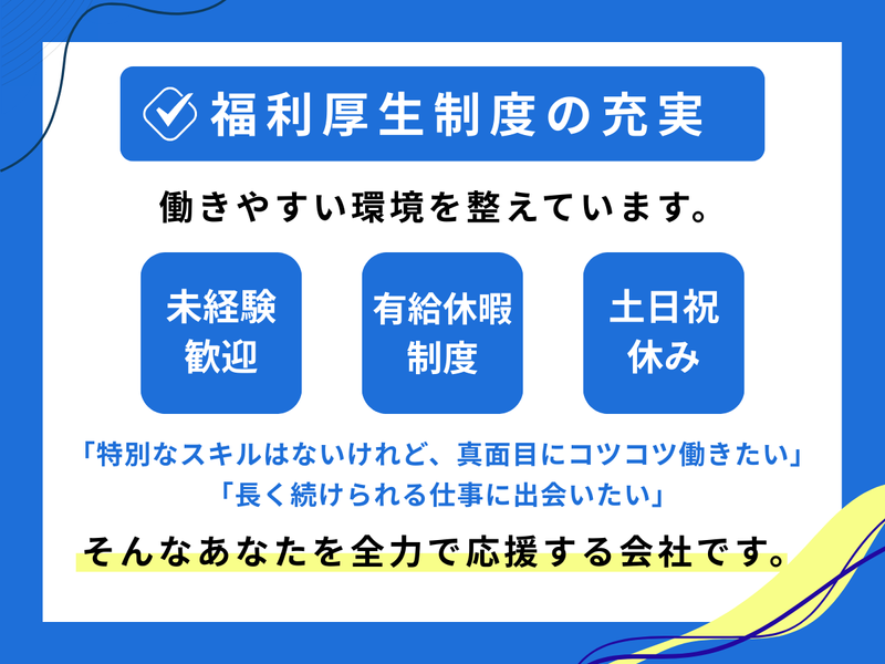 求めている人材 \ 学歴・年齢・経験不問!「誠実さ・人柄」重視の採用です / 「特別なスキルはないけれど、真面目にコツコツ働きたい」「長く続けられる仕事に出会いたい」そんな誠実な方を全力で歓迎・評価します! <働き方はあなた次第!未経験からプロへ> 「やってみたい」という気持ちがあればOK!未経験スタートの先輩も多数活躍中です。フリーターの方、「久しぶりのお仕事」というブランクがある方、副業・Wワーク希望の方もサポートしますのでご安心ください。 <経験者の方は即戦力として優遇> これまでの現場スキルを活かしたい方も大歓迎!以下の現場経験がある方は、給与面などでの優遇も検討いたします。 ・現場系: 土木、建築、解体、現場作業員 ・設備・内装系: 電気、水道、防水、設備、内装 ・職人系: 塗装、左官、大工、溶接 ※夜勤工事の経験がある方も歓迎します!