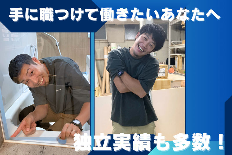 仕事内容 ▛▝▝▝▝▝▝▝▝▝▝▝▝▝▝▝▝▝▝ ▜ AIには置き換えられない、 一生モノの職人技術! イチから身に着けていきませんか? ▙ ▖▖▖▖▖▖▖▖▖▖▖▖▖▖▖▖▖▖▟ \\この仕事の魅力// ==================== ✨土日祝休・年間休日125日&有給取得率80%超 ✨未経験からの入社が8割以上!安心の指導体制 ✨直行直帰OK!社用車貸出&駐車場も会社負担 ✨独立支援制度あり!独立実績も多数◎ ✨コロナ禍も売上年率20%以上成長を継続 ==================== 「業界をリードする成長企業」の 施工業務に挑戦しませんか? 競合が存在しない独自技術で、 ホテル・住宅の浴室再生を提案する職人募集! |◤ 仕事内容 ◢|  ̄ ̄ ̄ ̄ ̄ ̄ ̄ ̄ ̄ ̄ ̄ ̄ ̄ ̄ ̄ ̄ ̄ ̄ ̄ ̄ 4,000万室を超えるホテルや中古住宅の 浴室を独自開発の改修技術「エコバスリフォーム」 で施工・リフォームしていただく仕事です! 具体的には…  ̄ ̄ ̄ ̄ ̄ ̄ ̄ ⏩シート・パネル貼付による再生 ⏩特殊な吹付塗装による再生 ⏩現場での養生や下地処理 ⏩完工後の確認と報告業務など 適性に合わせて業務を お任せしていきます。 AIによって自動化される仕事が多い中、 人にしかできない一生モノの 価値ある技術を未経験から身につけられます! ●エコバスリフォームについて  ̄ ̄V ̄ ̄ ̄ ̄ ̄ ̄ ̄ ̄ ̄ ̄ ̄ ̄ 当社の「エコバスリフォーム」は、 既存浴室を解体せずに新しい浴室に 生まれ変わらせる独自工法です。 当社では1つの専門工事に限らず 塗装、内装、設備、電気、防水など リフォームに関わる一連の業務を 経験することができます! 「多能工」としてのスキルも身につきます◎ ✅未経験者徹底サポート!充実の教育体制  ̄ ̄ ̄ ̄ ̄ ̄ ̄ ̄ ̄ ̄ ̄ ̄ ̄ ̄ ̄ ̄ ̄ ̄ ̄ ̄ 社員職人35名の平均年齢は27.5歳 8割以上が未経験入社です! マンツーマン指導に加えて、 自社開発の映像マニュアルなどを使って 習熟度別OJTで育成します。 ✅職人さんの待遇・環境の充実  ̄ ̄ ̄ ̄ ̄ ̄ ̄ ̄ ̄ ̄ ̄ ̄ ̄ ̄ ̄ ̄ ̄ ̄ ̄ ̄ 現場への直行直帰もOK!一人前になったら 社用車の貸し出しもあり、ご自宅付近に 駐車場も会社負担で確保します! また1人1台の社用スマホの貸出も行っています。 業績に合わせてインセンティブ(月1~3万円程度) もご用意しておりしっかり稼げる環境です。 ✅独立支援制度あり!多数の実績あり  ̄ ̄ ̄ ̄ ̄ ̄ ̄ ̄ ̄ ̄ ̄ ̄ ̄ ̄ ̄ ̄ ̄ ̄ ̄ ̄ 将来独立したいとお考えの方も全力で応援します。 独立後も、協力会社として仕事を提供するなど 支援し長期的にサポートしていきます! 既に先輩社員12名の独立実績があります◎ ✅残業を減らすDX環境!進化した働きやすさ  ̄ ̄ ̄ ̄ ̄ ̄ ̄ ̄ ̄ ̄ ̄ ̄ ̄ ̄ ̄ ̄ ̄ ̄ ̄ ̄ 業界では珍しい土日祝休み&年休125日◎ DX化を進め、残業時間の削減を実現しました。 プライベートと仕事のバランスを大切に できる環境づくりに取り組んでいます。 |◤ 当社について ◢|  ̄ ̄ ̄ ̄ ̄ ̄ ̄ ̄ ̄ ̄ ̄ ̄ ̄ ̄ ̄ ̄ ̄ ̄ ̄ ̄ 当社は2000年2月に設立され、 浴室リフォームを中心とした住宅リフォーム の企画・立案・商品開発・施工を行っています。 独自の浴室リフォーム工法「エコバス リフォーム」の提案・施工を強みとし、 現在は関西圏・首都圏・東海圏を中心に 事業を展開しています。※転勤なし ■社員インタビュー動画 《https://bsd.ecobath.com/company/recruit/#tab_panel-2》 ●SNSでも会社の情報を発信しています  ̄ ̄V ̄ ̄ ̄ ̄ ̄ ̄ ̄ ̄ ̄ ̄ ̄ ̄ ̄ ̄ ̄ ̄ SNSを通じて会社の取り組みや 雰囲気が伝わるコンテンツを順次公開 しております!ぜひご覧ください。