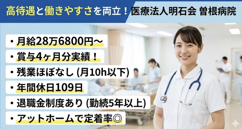 求めている人材 こんな看護師さんを求めています 【大手病院出身の方へ】 「大規模病院の複雑なルールや、ギスギスした人間関係に疲れてしまった…」 「スキルアップも大切だけど、自分の時間や家族との時間も大切にしたい」 【地元Uターン・Iターン希望の方へ】 「都会を離れて地元大分に帰り、地域に貢献したい」 「長く安定して働ける、安心できる環境を探している」 医療法人明石会 曽根病院は、地元佐伯市の健康を支えるケアミックス病院です。 中途入職者の定着率が高く、穏やかで風通しの良い環境が自慢です。 大手病院の煩雑さとは無縁の、患者様とじっくり向き合える環境で、 あなたらしく働きませんか? 【必須条件】 ✅ 看護師資格をお持ちの方 ✅ 患者様に寄り添った看護を 心がけられる方 ✅ チームワークを大切にできる方 ・‥…━━━━━━━…‥・ \こんな方歓迎!/ ⭐ 病院での勤務経験がある方 ⭐ 長く安定して働きたい方 ⭐ 地域医療に貢献したい方 ⭐ ケアミックス病院での勤務に 興味がある方 当院では患者様の健康を サポートする看護師を 募集しています。 地域密着型の病院として 地元の方々の健康を守る お手伝いをしていただける方を お待ちしています。 賞与支給実績約4ヶ月分と 頑張りをしっかり反映して もらえる環境で、長く安定して 働きたい方にぴったりです。 残業もほぼなく、プライベートと 仕事のバランスを大切にしながら 働くことができます。