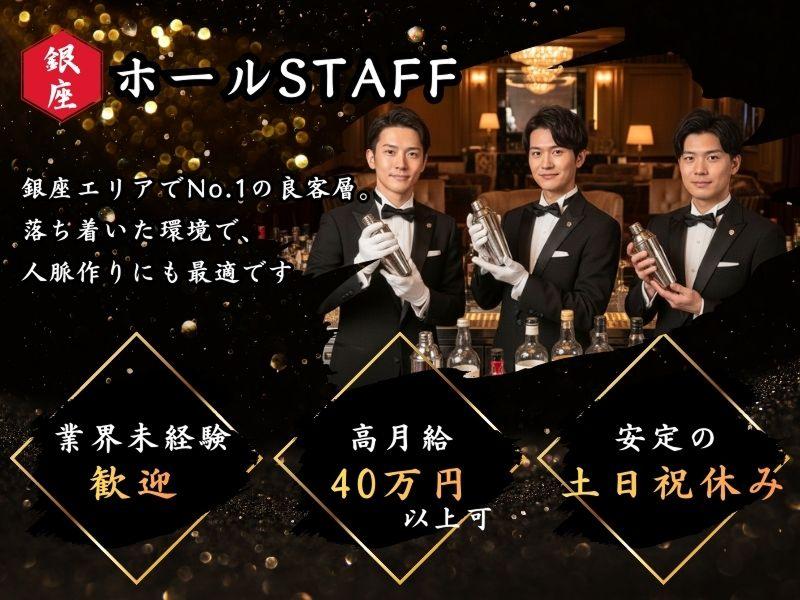 仕事内容: < 業界未経験多数!緩く働ける◎ミニクラブでの接客業務 > ◆未経験でも月給40万~スタート! ◆土日祝休み! ◆銀座では珍しい17時~のゆったり勤務! ◆100%店内での勤務のみ! 《仕事内容》 お客様に快適な時間を提供するための クラブ運営のサポート業務をお任せします! ◇ホールスタッフ◇ ●お客様のご案内(ご案内、お見送り、クローク対応)。 ●デーブルのセッティング(ドリンク、氷、グラスなどの交換・補充、片付け)。 ●開店・閉店準備、店内美化、備品管理など。 など。 スタッフに負担となる路上でのビラ配り・キャッチ・スカウトは一切ありません! 100%店内でのお仕事のみで安心して働けます! --------------------------------- 《こんな方にオススメ》 ・未経験OK ・経験者歓迎 ‧学歴不問、経験不問 ‧新卒‧第⼆新卒OK ‧フリーターさんOK ‧副業、WワークOK ‧主婦主夫OK ‧ミドル活躍 ‧ブランクOK ‧飲⾷店、居酒屋、ナイトワーク等の経験のある⽅活かせます ・アパレル、サービス業などの接客経験のある方活かせます ‧20代、30代、40代、50代活躍 ・ガッツリ稼ぎたい方 ・安定した職場で長く働きたい方 ・落ち着いた雰囲気の職場で働きたい方 ・一流の環境でスキルを身に着けたい方