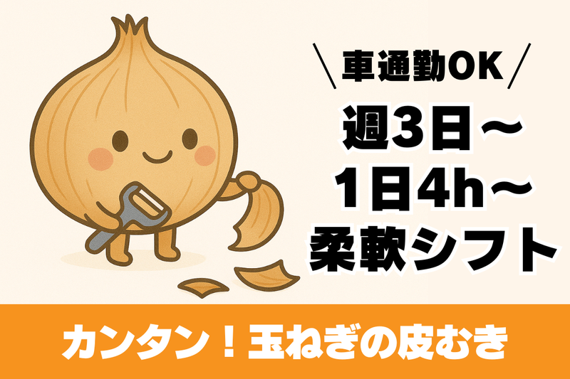 仕事内容 ■■■■■ー 注目!かんたんモクモク作業 週3日~&1日4時間~OK ー■■■■■ 専用の機械で玉ねぎの皮を シュッシュッとどんどんむいていくだけ! エアガンのような機械で 使い方もすぐに覚えられて、 調理などの経験も必要ナシ! 【お仕事内容】 ①玉ねぎの皮をむく ②箱に入れる ③箱を運ぶ 初めての方もすぐ慣れますよ♪ *基本的には座り仕事です *モクモク作業で時間もあっという間! *センターには車で通勤もOK 【おすすめPOINT】 ⭐週3日~、1日4時間~OK! ⭐扶養内勤務も可能 ⭐水曜・日曜は固定でお休み ⭐車通勤OK!無料駐車場も完備◎ ⭐社員食堂も利用できます! 【こんな方が活躍中】 ✅家庭と両立で無理なく働く主婦(夫)さん ✅地元で稼ぎたいフリーターさん ✅授業のない日に働きたい学生さん