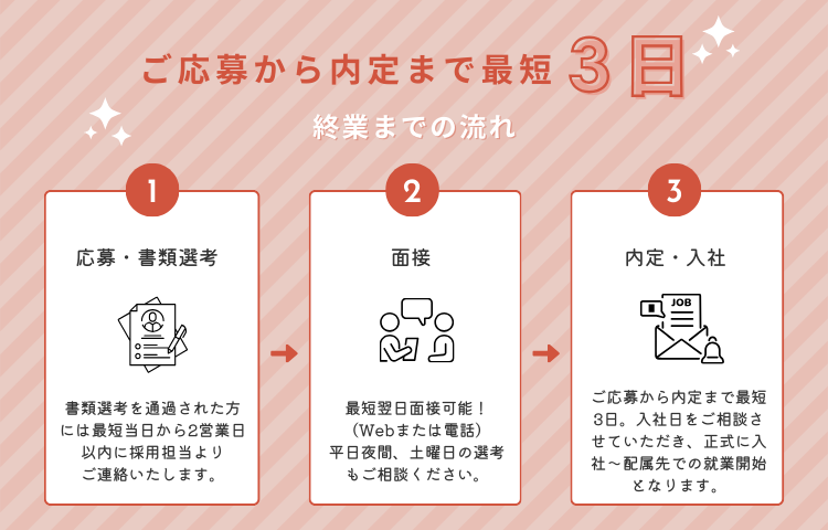 選考プロセス 【急募】最短3日で内定も可能です! 書類選考 書類選考→面接1回→内定 ※面接日・入社日はご相談に応じます。 \最短翌日に面接可能!/ ・面接は、主にWebや電話で実施します(スマホ・PC)ので、ご自宅からお気軽にご参加いただけます。 仕事内容や待遇、勤務地などの質問も大歓迎!不安や疑問をその場で解消できます。 ★面接時間は、30分~60分 ★最短3日で内定も可能です!