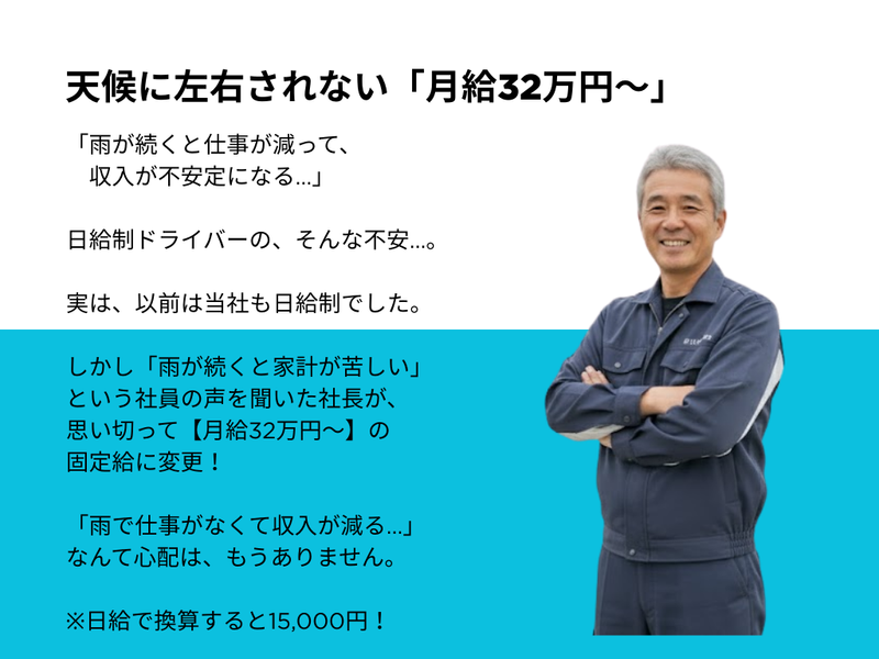 仕事内容 \\\ ✨電話応募OK✨ ///  ̄ ̄V ̄ ̄ ̄ ̄ ̄ ̄ ̄ ̄ ̄ ̄ ̄ ̄ ̄ ̄ ̄ ̄ 052-737-2313 担当/総務課 「求人を見た」とお気軽にご連絡ください! ⭐経験者の方は積極面接中!⭐ ⭐セカンドキャリアを全力応援◎⭐ *‥‥*‥‥*‥‥*‥‥*‥‥*‥‥* ⭐基本土日祝休み(会社カレンダーで土曜出勤あり) ⭐毎日家に帰れる!日勤のみ&地場運搬 ⭐月給32万円~の安定収入×天候に左右されない! ⭐残業ほぼなし!毎日夕方には自分の時間◎ ⭐有給取得率ほぼ100%!子どもの行事も安心♪ ⭐資格取得も応援!スキルアップ可能 *‥‥*‥‥*‥‥*‥‥*‥‥*‥‥* 「50代に入り、“これからの働き方”を見直したい」 「日給制だと、雨が続いた月の給与が本当に心配だ…」 「まだまだ現役。でも、無理はしたくない」 そんな長年の経験を持つベテランドライバーのあなたへ。 その悩み、立志建設で「安心」に変えませんか? 当社では、ドライバー経験者の多くが 「ここを最後の職場にしたい!」と言ってくれます。 その理由は、 【月給32万円~の安定】と【体に無理のない働きやすさ】の両立。 あなたの経験を、当社で存分に活かしてください!✨ *‥‥*‥‥*‥‥*‥‥*‥‥*‥‥* ■経験者が「ココだ!」と決める、 立志建設の魅力 ┈┈┈┈┈┈┈┈┈┈┈┈┈┈┈┈•• ✅ 【最大の安心】 天候に左右されない「月給32万円~」 「雨が続くと仕事が減って、収入が不安定になる…」 日給制ドライバーの、そんな切実な不安。 実は、以前は当社も日給制でした。 しかし「家計が苦しい」という社員の声を聞いた社長が、 思い切って【月給32万円~】の固定給に変更! 「雨で仕事がなくて収入が減る…」 なんて心配は、もうありません。 (※たまに軽作業をお願いする場合もありますが、 給与は安定支給です!) ✅【身体がラク】 毎日家に帰れる「日勤のみ」 運搬エリアは、 春日井市の車庫を拠点とした愛知県内の近隣エリアのみ。 長距離や泊まりがけの運転は一切ナシ! 毎日しっかり家に帰って、自分の時間を過ごせます。 ✅【体力負担ゼロ】 積み降ろし・力仕事 基本なし あなたにお任せするのは、10tダンプの「運転」がメイン。 砕石や砂利などの積み降ろしは、 現場の担当者が重機で行います。 重い荷物を持ったり、 手作業で体に負担をかけることはありません。 運転に集中できるので、 年齢を重ねても無理なく続けられます。 ✅【毎日が快適】 残業ほぼなし!17時には「お疲れ様」 「家族との時間は絶対に大事にしてほしい」 という社長の想いから、 残業はほとんどありません。 (※朝は早めですが、その分夕方にはきっちり終了!) 毎日決まった時間に帰宅できるので、 「家族とゆっくり晩ごはんを食べる」 「趣味の時間に没頭する」 「夫婦でのんびり過ごす」 そんな“当たり前の日常”を大切にできます。 仕事が早く終われば、 15時台に退社できる日も(もちろん給与は全額支給)! ✅【長く働ける】 これから10年を安心して働ける制度 「この先も、安心して長く働きたい」 そんな想いに応えるため、 「退職金制度」や「再雇用制度(規定有)」も整備。 実際に40代・50代のミドル層が中心となって活躍中! あなたのセカンドキャリアを、 会社全体でバックアップします。 ✅【休みも充実】 有給取得率100%&大型連休 「休みたいけど、言い出しにくい…」 そんな雰囲気は一切ナシ! 有給取得率は、なんとほぼ100%! 通院や、家族サービス、趣味の旅行など、 気兼ねなく取得できます◎ さらに、GW・夏季・年末年始は【各9連休】(実績あり)! 大型連休でしっかり体をリフレッシュできるのも、 長く働ける秘訣です✨ ■実際のお仕事内容 ┈┈┈┈┈┈┈┈┈┈┈┈┈┈┈┈•• 10tの大型ダンプを運転して、 砕石や砂利などの建設資材を 指定の現場までお届けするお仕事です! ✅ 運搬エリア 春日井市の車庫を拠点に、 愛知県内の近隣エリアのみ。 長距離や泊まりがけの運転は一切ナシ! 「夜遅くまで…」 「泊まりで家を空ける…」なんて心配もありません◎ ✅ 基本、積み降ろしなし! 現場の担当者が重機で行うため、 力仕事はほとんどなし。 あなたは運転に集中できるので、 体の負担も少なめです! ⭐ 教育体制 ────── ブランクがある方もご安心ください。 入社後は先輩のダンプに同乗し、 仕事の流れやルートを覚えるところからスタート。 自信を持って独り立ちできるまで、 ベテランが丁寧にサポートします。 ⭐ キャリアアップ ───────── 当社では、資格取得支援制度を完備。 大型免許はもちろん、車両系建設機械など、 仕事の幅を広げる資格取得も 会社がしっかりバックアップ! ドライバーとして経験を積むだけでなく、 「将来的には現場作業にもチャレンジしたい!」 という方も大歓迎です。 あなたの成長を全力で応援します✨ ⭐ 雨天時の業務について  ̄ ̄ ̄ ̄ ̄ ̄ ̄ ̄ ̄ ̄ ̄ ̄ 基本はダンプでの運搬業務が中心ですが、 雨天などで現場がストップする場合には、 ✅ 現場での軽作業サポート ✅ 車両の洗車・清掃 ✅ 簡単な整備補