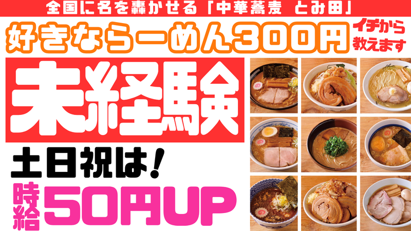 仕事内容 業界で有名な【中華蕎麦 とみ田】 この度、アルバイト・パートを増員。 学生さんも積極採用します! ◤ とみ田の魅力はこちら ◢  ̄ ̄ ̄ ̄ ̄ ̄ ̄ ̄ ̄ ̄ ̄ ̄ ̄ ̄ ✔ 好きなラーメンが300円で食べられる スタッフだけの特権です◎ - ✔ 未経験・バイトデビュー歓迎! 先輩がしっかりサポート! 飲食バイトが初めてでも安心♬ - ✔ 友達と一緒の応募もOK 「1人だとちょっと不安…」 そんな方も気軽にスタートできます! - ✔ シフト相談OK 学校や予定との両立もバッチリ! - ✔ フルタイム勤務・社員登用制度あり! 将来を見据えて働ける! - ✔ 有名店で働く”レアバイト” 履歴書にも映える!? 有名ラーメン店での経験は一生モノ! - 【バイト・パート募集】 有名ラーメン店「とみ田」グループ  ̄V ̄ ̄ ̄ ̄ ̄ ̄ ̄ ̄ ̄ ̄ ̄ ̄ ̄ ̄ ̄ ̄ ̄ シフト相談OK/未経験歓迎/まかないあり ◤ ラーメン好き必見 ◢ 全国にファン多数! あの「中華蕎麦 とみ田」の支店で、 キッチンのアルバイト・パートを大募集。 「食べログ百名店選出」 「メディア多数掲載」など、 全国的に有名なラーメンブランドで 働けるチャンスが到来です! 「ラーメンが好き!」 「バイトデビューしたい!」 「ガッツリ働きたい!」 学生さんもフリーターさんも大歓迎! とみ田の仲間としてお迎えします。 ◤ ̄ ̄ ̄ ̄☎⋆.✩ ̄ ̄ ̄◥ お電話でのご応募も歓迎 ℡/043-853-8311 ◣__________◢ 【千葉県松戸市発】 全国に名を轟かせる「中華蕎麦 とみ田」。  ̄V ̄ ̄ ̄ ̄ ̄ ̄ ̄ ̄ ̄ ̄ ̄ ̄ ̄ ̄ ̄ ̄ ̄ 行列の絶えない濃厚豚骨魚介つけ麺の名店。 数々の賞を受賞しており、 ラーメン業界でも トップクラスの知名度を誇ります。 ▼こんな方にピッタリ!  ̄ ̄ ̄ ̄ ̄ ̄ ̄ ̄ ̄ ̄ ̄ ・学校やサークルと両立したい学生さん ・ガッツリ稼ぎたいフリーターさん ・飲食店・接客業に興味がある方 ・将来、正社員や独立を目指して 経験を積みたい方 ・とにかくラーメンが大好きな方
