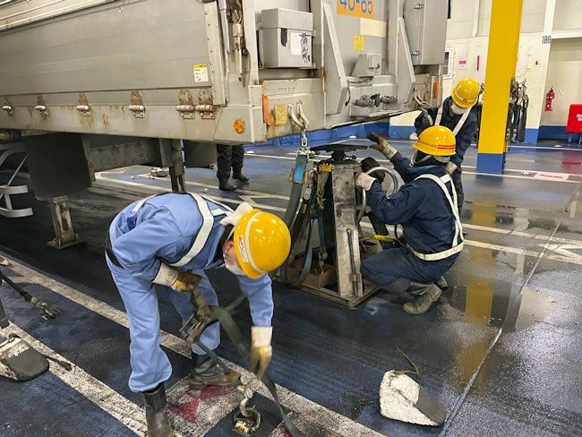 停泊中フェリー内の車輌固定作業