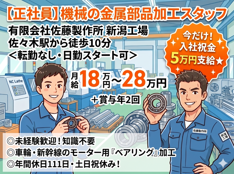 仕事内容 -今だけの最大特典!早い者勝ち- ★3か月後に入社祝い金5万円支給★ \確かな技術を未来に!/信頼性バツグンの会社で、 日本の“モノづくり”を支える仕事にチャレンジ! 車輪や新幹線のモーターなどに使われる 『ベアリング』をメインに手がけている私たち。 普段目にすることはありませんが、 実は1台の車には約150個もの『ベアリング』が使われているんです! 今回募集するのは、当社の【金属加工オペレーター】 たくさんの人の暮らしを、縁の下から支える。 ――そんな“モノづくり”を、私たちと一緒に始めてみませんか? あなたにお任せしたいのは、実際の【加工】の部分。 当社ではボタンを押せば金属を削ってくれる『NC旋盤』 という機械を使っているので、難しい作業はありません☆ ■入社後の流れ まずは会社や製品について知るところからスタート! 「私たちの製品は実際にどんなところに使われているのか?」など、 佐藤製作所の“基礎”から教えていきます。 その後は先輩たちが働いている現場で、仕事の様子や進め方を確認! 個人差はありますが、1~2週間ほどで1人で作業を進められるようになっていきますよ☆