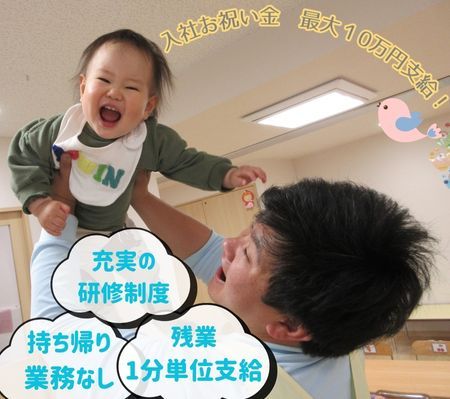 企業主導型保育園の常勤保育士 【入社お祝い金最大10万円】完全週休二日制、研修制度、手厚い福利厚生で、理想のワークライフバランスを叶えられます♪ 【Features 特長】 未経験者歓迎 ブランクOK 経験者歓迎 駅チカ PC活用 【仕事内容】 0歳~2歳児(定員18名)の年齢や成長に応じた保育業務全般を行って頂きます。 ・着替え、食事の補助 ・保育環境の整備(主活動の準備、清掃等) ・保護者対応 ・帳票作成 など ※未経験、ブランクがある方も丁寧に研修します。 実際にブランクがある方も活躍しているので安心してください! ※持ち帰り仕事なし。 ※保育記録などはICTシステムを導入しており業務効率を図っています。
