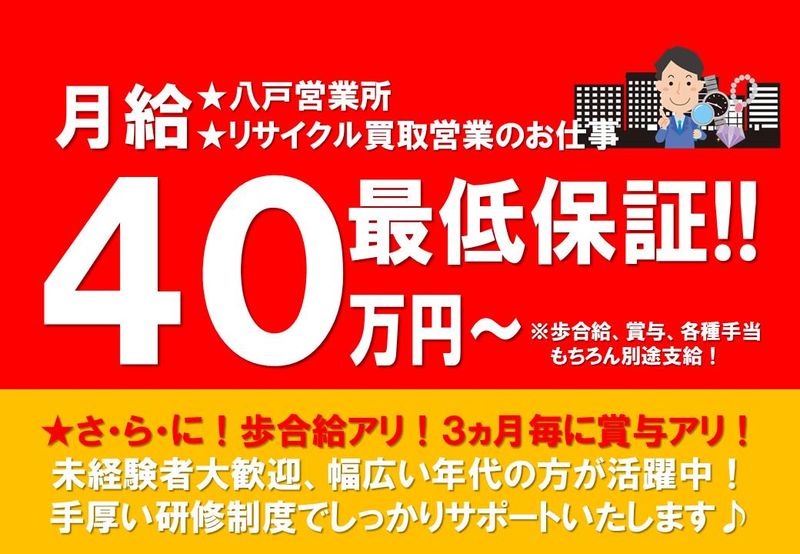 仕事内容 あらかじめご予約いただいたお客様宅を訪問して不用品を買い取るお仕事です! 商品を売るのではなく、こちらが買い取りを行うので嫌がられることもありません。 また、事前に弊社コールセンタースタッフが問い合わせ頂いたお客様への訪問日時を調整してからお伺いするので、飛び込み訪問などは一切ありません。 ・アポイント日にお客様宅を訪問、品物の査定 ・提示した買取価格にご納得いただけたら買取成立です。 品物の査定について 研修で買取品の査定方法についてしっかりと学ぶことができるので未経験の方もご安心下さい。 判断ができない場合は撮影した画像を専任の担当者に送り査定依頼もできるので心配はいりません。 こんな方にピッタリ! ・やりがいのある仕事をしたい ・人と話すが好き ・ブランド品や不用品のリサイクルに興味がある ・年功序列が好きじゃない ・実力主義で成り上がりたい ・営業は好きだけど前職で報酬が少なかった ・高いインセンティブ報酬で沢山稼ぎたい ・自分らしさを活かした営業をしたい 訪問時にお客様からお金をもらうことは一切ありません。お客様に損は無いお仕事だからこそ、やりやすく、稼ぎやすい、そんな営業なのです。 先輩スタッフからの一言 2022年7月入社 (32歳男性 前職:工場勤務) 30代での転職で未経験の職種だったので、最初は不安もありましたが、年齢に関係なく先輩社員がしっかりと研修から同行してくれたので、今では気兼ねなく自分らしい仕事ができるようになりました。 ガチガチの営業スタイルではなく、とても自由にやらせてもらえるので『やってみたい!』『自分の営業スタイルで稼ぎたい!』という方にとてもオススメです! 2023年2月入社 (21歳男性 前職:塗装屋勤務) 自分は学歴もなく、営業も未経験でした。結婚して子供もいるので『家族で豊かな生活を送りたい』この一心で転職を決意し、研修中も本気で取り組んできました。 その結果半年で営業主任を任せてもらえるまでに成長し、収入も大幅に上がり、人生が変わった!と本気で感じています!努力は裏切りません! 正直きつい時もあるけど、サポートしてくれる上司や仲間もいます。 僕はもっともっと上を目指しているので、皆さんも勇気の一歩を踏み出してみてください! 【代表から一言】 皆さんこんにちは。代表の本川です。 突然ですが、営業職は正直とても大変です。ですが、弊社の営業職は努力さえ継続できればどんな人でも稼ぐことができます。 なかなか結果が出ない先輩もいれば、代表の私よりも収入が高い従業員も実際におります。 現場で結果を出す人が沢山の収入を得るのは当然の権利だと考えているので、全員が私の収入を追い抜いてくれるのが今の目標です。 努力を継続し続ける根性。そんな熱い心が大好きです。と言っても昔の体育会系のような雰囲気では無いのでご安心ください。(笑) 実力主義です。年齢は関係ありません。 SNSでよくある危ない高収入バイトでもありません。 人と関わって自分を磨きたい。 人生を変えたい。 もっと稼ぎたい。 私が稼がせてみせます。後は自分次第です。 熱い心を持った皆さんのご応募お待ちしております。