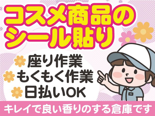 仕事内容 【おすすめポイント】 ・日払い、週払いOK ・シンプル作業 ・完全座り仕事 ・土日休み ・短期も相談OK 【職場環境】 ・空調完備 ・広くてキレイな休憩室あり ・ロッカーあり ・給湯室あり ・分煙室あり ・飲料、食品自販機あり ・柏駅より送迎バスあり ・髪色自由 ・ネイルOK ・お弁当購入可能 【お仕事内容】 海外ブランドコスメにシールを 貼っていただく簡単なお仕事です。 ・空調完備の倉庫内にて、座ってモクモク作業! ・デパートコスメに見本通りにシールを貼るだけ! ・一部梱包作業などもございます。 【コーディネーターのおすすめポイント】 ・空調完備の快適な職場で、座り作業&黙々とシール貼りに集中できます。 ・取り扱うのは、目で見ても気分が上がる人気のブランドコスメ! ・かなり広くてキレイな休憩室あり!お弁当の販売もあってランチタイムも充実! ・柏駅から大型送迎バス運行中!無料で利用できます! 【GWJが"ぴったりのお仕事"探しを応援】 GoodWorkJapan/グッドワークジャパンは「人に合う仕事探し」を大切に、 ・日払い対応 ・Web面接 で スムーズな就業・転職をサポートします。 面談後は職場見学で実際の雰囲気を確認できるので安心です。 まずは登録から!あなたのご希望をお聞かせください! ここまでご覧いただきありがとうございます。 興味を持っていただけた方はお気軽にご連絡ください。