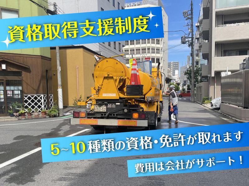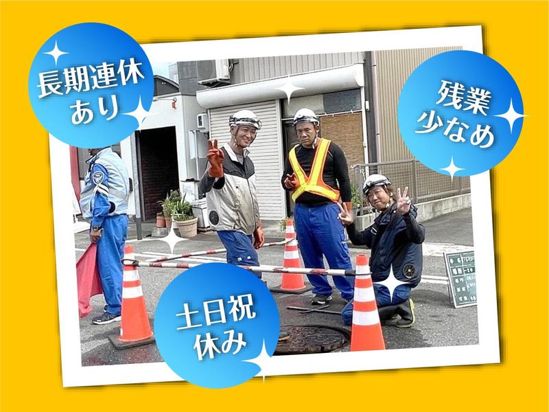仕事内容 ***このお仕事のおすすめPoint!*** ■公共インフラに関わるお仕事だから、 景気に左右されにくく安定した仕事量。 長~く安定して働くことが可能! ■中型免許や大型免許、 土木施工管理技士などの資格も 制度を利用して取得することが可能だから 手に職つけられる! (対象の資格は5~10個あります。) ■土日祝休みでGWやお盆、 年末年始には長期連休あり! 残業も少なめでプライベート充実! ■初めは月給23万円ですが 「もっと稼ぎたい!」という方は 休日出勤も相談OK! 月収30万円稼ぐ、未経験からスタートした 20代の先輩スタッフもいますよ。 あなたのご希望をお聞かせください! <少しでも「いいな」と思っていただけたら まずはお問い合わせください! 職場見学も大歓迎!> ***具体的な仕事内容*** 街中の水が流れているところ(河川、池、 用水路、下水道、排水管、雨水桝など)を キレイにするお仕事です。 「知識もないし、未経験だから不安…」 なんて方もご安心ください! まずはコーンを配置したり、 現場のフォローから始めていきましょう! ***下水管清掃をするときの流れ*** (1)対象の場所に作業車輌を設置 (2)作業エリアをコーンなどの 保安機材で囲む (3)マンホールのフタを開けて清掃スタート (4)洗浄車のホースを投入し、高圧洗浄 (5)下水道管内の土砂などの異物を 吸引車で吸い上げ (6)蓋を閉め、機材を片付け、次の現場へ