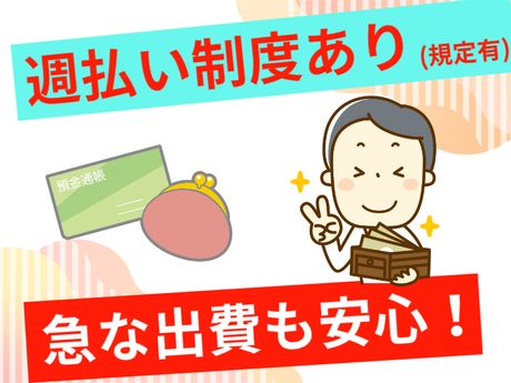【保険制度】 雇用保険、労災保険、健康保険、厚生年金 待遇・福利厚生 【福利厚生】 ・社会保険完備 ・交通費全額支給 ・昇給、賞与あり ・赴任費全額負担 ・制服貸与 ・車通勤OK ・敷地内に駐車場完備 ・ロッカー完備 ・休憩室あり ・自動販売機あり ・週払いOK(規定)