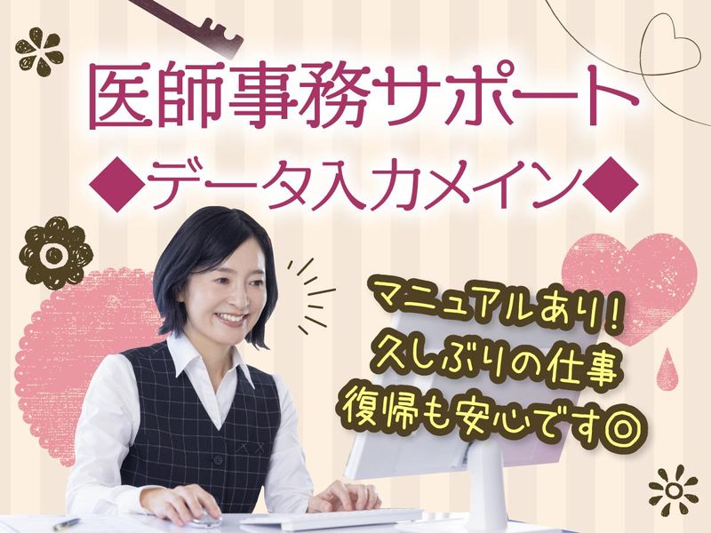仕事内容 \ 裏方さん大募集! / 医師の事務サポートスタッフを募集♪ 病院の最前線で活躍するドクターやナース、 来院された患者様やご家族・関係者の方を 「「陰から支える」」オシゴト!! ▼▼ おすすめPOINT ▼▼ ✅高時給1450円 ✅残業なしの17時15分定時 ✅土日祝休み ✅ビジネスライクな働き方 ✅長く安定♪大学病院でのオシゴト お仕事詳細  ̄V ̄ ̄ ̄ ̄ ̄ 医師の事務サポート全般をお願いします。 データ入力が中心です◎ 他の医師事務スタッフが沢山いるなかでの お仕事なので、分からないことがあれば すぐに聞けます! 「黙々データ入力」だけでなく 人と接する機会もあるので バランスがよく飽きません◎ *電子カルテの代行入力 *文書作成 *検査予約など 1日の流れ(一例)  ̄V ̄ ̄ ̄ ̄ ̄ ̄ ̄ ̄ 【08:30~】出勤!来ているメールを確認 【09:00~】午前中は電子カルテの代行入力 フォーマットに打ち込むだけ◎ 【12:00~】休憩 【13:00~】午後は検査の予約受付・ 書類作成 【~17:15】定時退社♪お疲れ様でした! 【実際働いているスタッフ】 ■他業界から転職した20代・30代 ■久々にお仕事復帰/復職した40代 ■パートから切り替えたママさん ■子育てが一段落した主婦さん \年齢・性別・経験・ブランク不問/ 「久々にお仕事復帰したい」方の復職、 「今の職場から環境を変えたい」方の転職も歓迎! 「病院での仕事は初めて」という方もご相談ください◎ 働くうえで困ったことや不安なこと 勤務条件についてのご相談は あなた専属のコーディネーターが 何でも相談にのります◎ ・・・・・・・・・・・・・・ \スタッフの声をご紹介/ ▼40代/病院事務未経験▼ お客様対応があるような前に出る仕事より、 コツコツと入力作業を進めるとか 書類の整理とか、そういう裏方っぽい 事務作業がもともと好きだったんですね。 ミスや漏れのないようにきちんと データをチェックしてまとめて…みたいな。 前のパート先は全くの他業界でしたが、 仕事内容としては近かったです。 ただ、子供が中学に入って家を空ける時間が 多少長くなっても大丈夫になったので フルタイムに転向した途端に ちょっと表に出る仕事が増えてしまって…。 これは私がやりたいことじゃないぞと(笑) 長く勤めていたところだったので、 正社員登用してくださるつもりだったのかも しれないですが、仕事の向き不向きを 考えたらちょっと違うな~となり、 転職を決めました。 こちらの病院さんでの仕事も少しは 対人業務ありますけど、基本的には データ入力や書類作成が多いので 「裏方派」な私としてはかなり嬉しいです! 医療業界でのお仕事は初めてでしたが、 周りのスタッフさん達が基本的な 用語やソフトの使い方から教えて くださったので不安はなかったです。