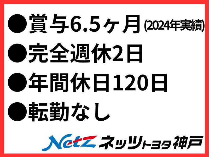 仕事内容 ✅社内SEの仕事です。 兵庫県内に19店舗があります。 本社を含めると20拠点の社内システムの保守管理や改善業務、新しいシステムの導入・検討などを行います。 またパソコンや社用携帯の管理やセットアップ、アカウント発行などの手続き業務もお任せします。 ITの知識をお持ちであれば、現在の勤務業界は問いません。 ✅火・水は完全休業  ̄ ̄ ̄ ̄ ̄ ̄ ̄ ̄ ̄ 火曜・水曜は全店舗休業なので、全員が固定の二連休となります。 ✅どの車種で通勤しても通勤手当支給  ̄ ̄ ̄ ̄ ̄ ̄ ̄ ̄ ̄ ̄ ̄ ̄ ̄ ̄ ̄ ̄ ̄ トヨタ系列以外の車でも、さらには自社購入でなくても、全員に通勤手当(上限10万円/月)を支給いたします。好きな車で通勤してください。 電車バス通勤もOK ※面接は尼崎本社て行います。 店舗についてはHPに記載しております。 https://www.netzkobe.co.jp/store 現職での退職時期が決まっていない、 入社時期を相談したい、などなど 柔軟に対応いたしますので、 何でもお気軽にご相談ください。