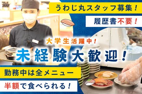 仕事内容 【仕事内容】 <未経験ok♪幅広い世代のstaff活躍中☆> <食事補助あり☆メニュー全品50%off♪> <頑張りに応じて昇給あり☆> <★ホールの仕事内容★> ・バッシング・レジ業務 ・デザート・ドリンクの作成 ・お席のご案内・システム説明 ・配膳・テーブルの備品補充 など <★うわじ丸のここがオススメ★> ・メインはお席のご案内・レジ作業・バッシング! →配膳のお仕事よりもダントツで多いです☆ 回転寿司なのでほとんどはお客様の元に レーンでお料理が運ばれます♪ レーンに乗らない料理のみ お席までお持ちします★ ・勤務中に食事をとる場合、メニュー全品50%off →お寿司が何と半額で食べられる!!! お寿司も揚げ物も麺類もデザートも全て半額☆ 産地直送のお寿司なので新鮮です♪ 一押しの福利厚生です! ・幅広い世代の方が働く店内! →10代・20代・30代・40代・50代以上も活躍中☆ わからないことがすぐに聞ける環境で 未経験の方でも安心して働けます♪