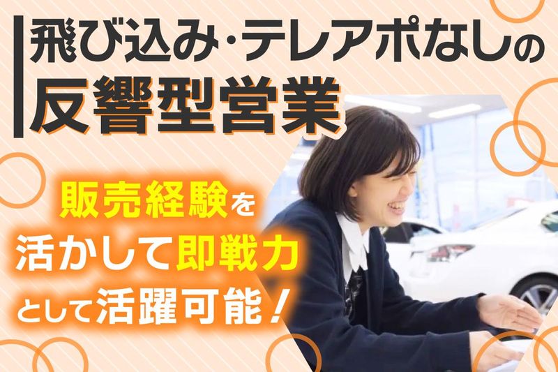 仕事内容 「成果に応じた収入を得たい」 「これまでの経験を、 より価値のある形で活かしたい」 「30代からのキャリアを、 もう一度しっかり積み直したい」 そんな想いを持つ方にこそ、 当社の環境はフィットします。 当社のセールスは、 ◆飛び込みなし×完全反響型 の営業スタイル。 それでいて ◆月給35万円以上スタート +成果に応じたインセンティブ という収入構造が整っています。 20〜30代の若手中心の組織ながら 評価制度は非常に明確で、 続けるほど成果の再現性が高まるため 「実力でキャリアを築きたい」 そんな方が力を発揮しやすいです。 ━━━━━━━━━━━━━━━ 100%成果主義& 継続が成果につながりやすい ━━━━━━━━━━━━━━━ ⭐月給35万円以上スタートの安心感 実力主義の会社ですが、最初から “高い固定給の土台”があることで 生活の安定を確保しながら 成果に集中できます。 成果次第で月給85万円も可能なため、 『ここから収入を大きく伸ばしたい』 という方にとって理想的な仕組みです。 ⭐飛び込みなしの完全反響型 飛び込みや無差別アプローチではなく、 興味を持って来店された お客さまへの提案が中心。 法人・個人を問わず、 これまでに培った営業経験や 販売・接客などの経験を “より効率よく”活かせます。 ⭐努力が正当に評価される制度 ・昇給:年2回 ・昇格:年2回 ・インセンティブ: 実績に応じて毎月支給 短期の数字に 振り回されるのではなく、 “継続した取り組み” を しっかり評価します。 ━━━━━━━━━━━ お任せする仕事内容 ━━━━━━━━━━━ 中古車の販売・買取に関する、 内勤中心の反響対応セールスです。 【 主な業務 】 ◆来店されたお客さまへのヒアリング ◆最適な車両やプランのご提案 ◆試乗・見積もり対応 ◆契約書類の作成・手続き ◆納車までのフォロー ◆納車後のメンテナンス案内 ◆チームミーティングで情報共有 飛び込みやテレアポではなく、 “来店のきっかけ”を活かして 提案する営業のため、扱いやすく、 成果に結びつきやすいのが特徴です。 ━━━━━━━━━━━━━━━━━━━ 「居心地がよく続けやすい」 そんな声も多く上がっている環境です ━━━━━━━━━━━━━━━━━━━ ✨安定基盤: 完全週休2日制+有給取得率90%超 収入アップを目指しつつも、 無理を強いられる環境ではありません。 家族の時間や自己投資の時間も 大切にできます。 ✨若手中心の組織で挑戦しやすい 20〜30代中心の活気ある環境で、 意見を出しやすく、新しい挑戦も 歓迎される文化があります。 ✨長く続けるほど成果が安定 ・反響営業で再現性の高い仕事 ・評価制度が継続を重視 ・チーム体制でフォローあり ・全社合同研修(月1回)で 経験値が増える 結果、 「腰を据えて働くことで 実力が収入へ変わっていく」 という理想的なサイクルが生まれます。 これが、長く働きたい方から 選ばれている理由です。