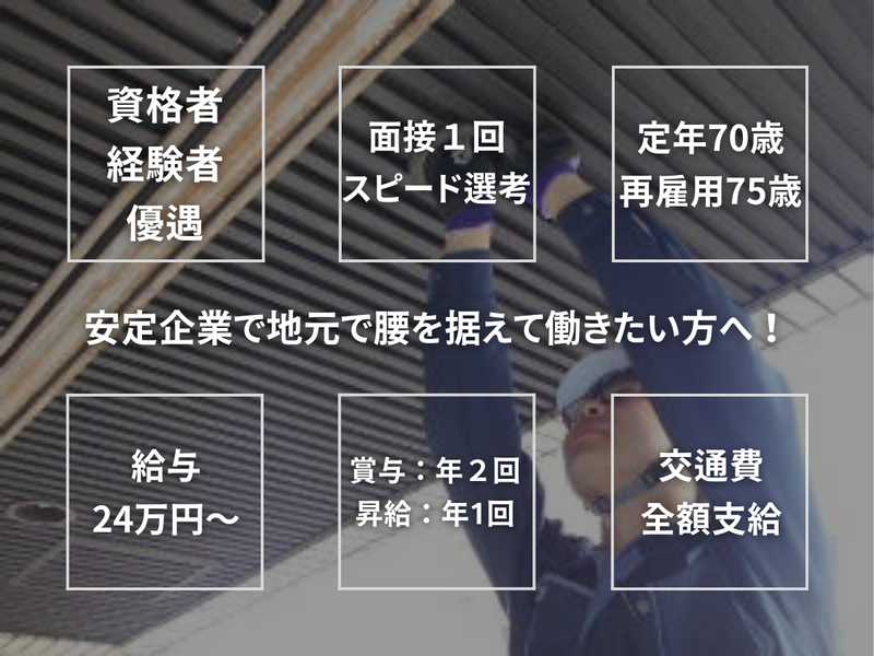 求めている人材 ブランクOK! 常駐の設備管理や 病院の施設管理が初めての方でも大歓迎! 【必須条件】 *高卒以上 *設備管理や施設管理、ビルメンテナンス、 建物管理やビル管理の経験者(経験年数は不問) 【こんな資格をお持ちの方は 活かせます!】 ・第二種電気工事士免許をお持ちの方 ・2級ボイラー技士をお持ちの方 ※資格は必須ではありませんので お気軽にご応募くださいませ。 【こんなタイプの方にぴったり】 ・安定企業で腰を据えて働きたい ・家の近く、通いやすいエリアで働きたい ・施設内で常駐の仕事がしたい ★スピード選考実施中! 今、在籍中の方も離職中の方も、 あなたのご希望に合わせて面接を実施させていただきます。 こちらからの一方的な面接にならないよう 会話形式でお話ができればと考えております。 疑問、質問、何か不安なことがあればお申し付けください♪ 年齢の条件と理由:あり(例外事由1号・70歳未満(定年のため))