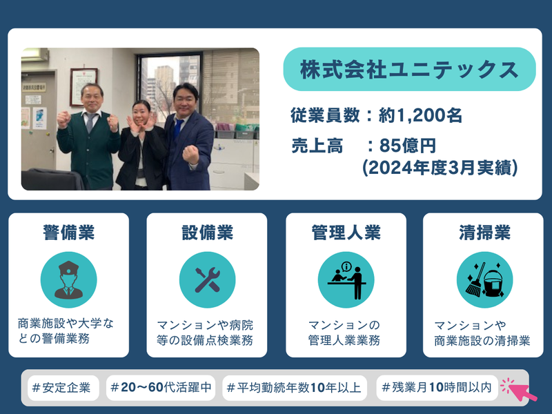 仕事内容 \アピールポイント/ ●「常駐×落ち着いた現場」で バタバタしない働き方 ●24時間勤務でも「明け+休み」で 実質週3日休みペース ●不特定多数の出入りが少なく、 クレーム対応などナシ ●設備管理経験を活かして、 無理なく長く働ける ●ブランクあり、病院未経験でもOK 資格不問/経験年数不問 月給24〜28万円+賞与あり! ●奈良・梅田・なんばからもアクセス◎ 【仕事内容】 八尾市立病院での設備メンテナンス、 施設管理をお任せします。 ◆設備の点検 ◆簡単な修繕・営繕対応など、 病院を支えるやりがいのある仕事です。 入社後は先輩がマンツーマンで指導。 「久しぶりの現場」 「病院管理は初めて」でも安心! スキルを活かしつつ、 さらに専門性を高められる環境です。 ■株式会社ユニテックスについて 従業員数1200名、 売上高83億円(24年3月実績)の 安定企業です。 ビル、マンション、有名テーマパーク、 ホテル、企業、病院、学校法人、銀行 …など、全国の幅広い施設を顧客とし、 警備業、設備業、管理人業、清掃業を 行っております。
