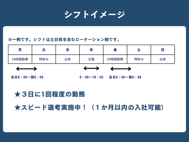 勤務時間詳細 総労働時間:1ヶ月あたり173時間18分 1ヶ月単位の変形労働時間制 (1)9:00~18:00 休憩:60分 (2)9:00~翌8:59 休憩480分 ★シフト例:その1★ 月:24時間勤務 火:明け休み 水:休み 木:日勤 金:休み 土:24時間勤務 日:明け休み ★シフト例:その2★ 月:日勤 火:24時間勤務 水:明け休み 木:休み 金:日勤 土:休み 日:24時間勤務