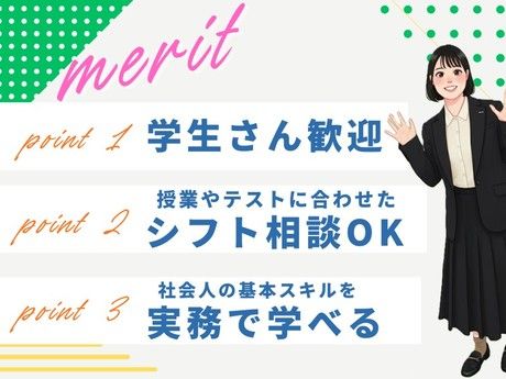 仕事内容 ▼おすすめポイント▼ \未経験スタート可能/ 20~30代の方がメインで活躍中!! 社会人マナーやPCスキルが身につくので学生さんも大歓迎! 私たちと一緒に働きませんか? ・未経験積極採用中! ・成長中の企業で自分もスキルアップできる〇 ・社会人の基本スキルを実務で学べる ・週2日~ご勤務OK! 授業やテストに合わせてシフトのご相談可能です◎ 「仕事が見つかってよかった...ありがとう!」 そんなお言葉をいただくことも! そんな【やりがい】のあるオフィスワーク PCの基本操作ができればOK! 社会人マナーやPCスキルも身につくので、 就活前に社会人力をぐんと伸ばせるチャンスです! フォロー体制充実◎未経験の方も安心の環境そろってます! ▼お仕事内容▼ 短期・単発のお仕事を希望しているスタッフさんに、 スムーズに働き始められるようにサポートするお仕事です。 <主な業務> 【1】募集中のお仕事に対する業務 ・案件ごと応募フォーム作成 ・シフト登録 ・お問い合わせ対応(メール・電話) など 【2】資料や資材の準備 ・文具の準備 ・案内資料の作成 ・マニュアル封入・発送 など <やりがい> 「仕事が見つかってよかった…ありがとう!」 そんな言葉をいただけることも多く、 人の役に立っていることを実感できるお仕事です。 ▼一緒に働く仲間は…▼ ●20代女性 「初めてのオフィスワークで不安もありましたが、 先輩が丁寧に教えてくれて、すぐに職場に馴染めました! シフトも学業に合わせて柔軟に対応してもらえています。」 ●20代男性 「未経験スタートからでも、一つひとつの頑張りをしっかり見てもらえる環境です。 今後の進路や働き方を考えるよい経験になっています」 「社会人経験がないから不安…」という方も 丁寧なサポートがあるので安心してスタートできます〇 今活躍中の方の前は、 カラオケ店員、アパレル店員、塾の先生などなど...様々! 異業種からの転職もOK! ▼身につくスキル▼ 〇PCスキル お仕事をしながら、自然とタイピングスキルが身につきます! 入社当初はキーボードを見ながら入力していたスタッフさんも、 今ではサクサク入力ができるようになりました◎ 〇ビジネスマナーや言葉遣い 先輩スタッフの電話対応や立ち振る舞いを間近で学べます! さらに、しっかりとしたマニュアルがあるので、最初はそれを読むだけでOK! 就活に役立つ、オフィスワーク経験が積めること間違いなし◎