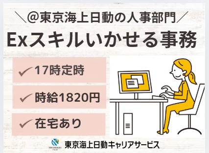 仕事の内容 \コツコツ!エクセルいかせる事務/ ◆紙の書類多め@時1820円 ◆ほぼ電話なし!あっても取次だけ ◆在宅OK、基本残業なし…働きやすい環境整ってます◎ 【基本情報】 雇用形態:派遣社員 雇用期間:長期(3カ月以上) └26年1月~開始日相談可能 就業時間:9:15~17:00(休憩60分) └9時30分開始や16時定時も応相談 【必須条件】 ◆エクセル:入力修正〜計算式、SUM関数 【お仕事内容】 ・資料の作成 ・Excel入力~加工 ・各種証明書の発行 ・内線取次(1日1~2本) など ◆分からないことがあれば、社員さんに気軽に質問・確認OK 【環境面等】 @大手町駅直結&東京駅日本橋口スグ! ┗「TOKYO TORCH」常盤橋タワー高層階でのご勤務♪ ・東京海上日動の人事部門 ・30代・40代の多い職場 ・穏やかで落ち着いた雰囲気 ・ランチタイムは休憩スペース利用OK └お弁当持参OKです ・オフィスカジュアル内で服装自由 └スニーカーOK、ナースサンダル等への履き替えもOK! 【福利厚生等】 ・社会保険完備 ・定期健康診断あり ・禁煙オフィス!煙苦手な方も安心 ・平日のみOK!土日祝休み ・年間休日120日以上&お休み相談可 └有給休暇、年末年始休暇など ○●嬉しいPOINTたくさん!●○ 履歴書不要!開始日相談OK/長期/大手町駅直結/駅チカ/駅歩5分以内/社員に相談できる/月収例24万円以上/社会保険完備/残業月5時間以内/17時退社/7時間以内勤務/時間応相談/在宅ワーク