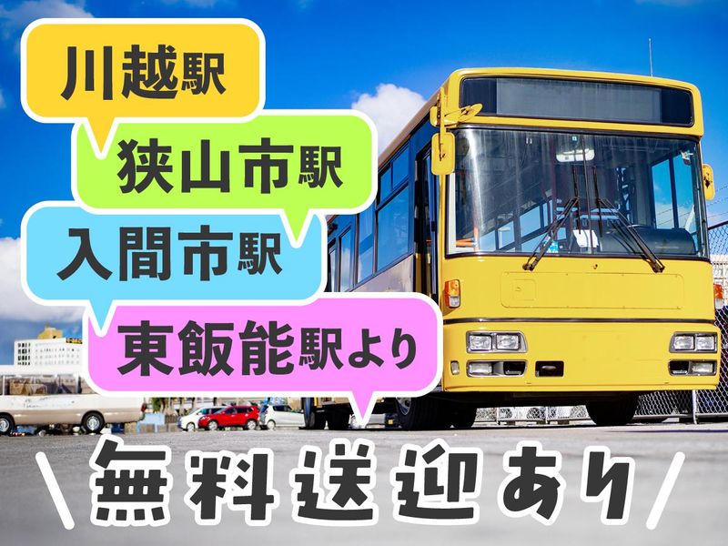 【保険制度】 雇用保険、労災保険、健康保険、厚生年金 待遇・福利厚生 【福利厚生】 *週払い(規定) *交通費全額支給 *社会保険(法令) *食堂・休憩室 *服装・髪色自由 *川越駅・狭山市駅・入間市駅・ 東飯能駅より無料送迎バスあり *車・バイク・自転車ok(無料駐輪場完備)