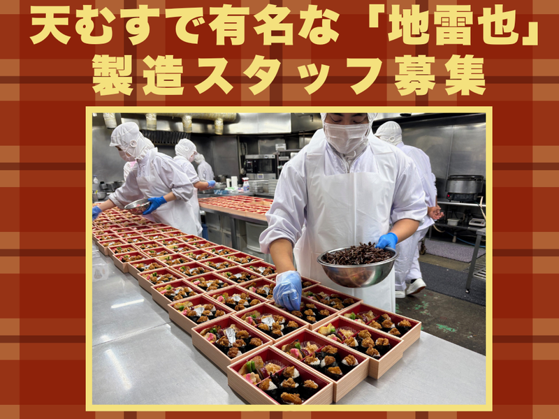 仕事内容 名古屋名物「天むす」で 人気の地雷也(じらいや)! 東京・池袋・日本橋・二子玉川の百貨店 新幹線ホーム・空港の売店で「お弁当」や 「天むす」が販売されています。 関東店舗の商品を清澄白河セントラルキッチン (東京工場)で製造しています。 ✨♦°˖⭐°˖✨♦°˖⭐°˖✧✨♦°˖⭐°˖✧ 「天むす」お弁当の製造スタッフ募集☆彡 当社の特徴として機械のライン工場ではなく 1つ1つ手作業で作っています。 地雷也の工場は全て手作業で真心を込めて 美味しい「天むす」お弁当を作っている工場です。 未経験の方も安心して勤務できます。 ✨♦°˖⭐°˖✨♦°˖⭐°˖✧✨♦°˖⭐°˖✧ <担当する仕事内容> ⏩お米の炊飯 (お米を研いで水に浸けて 電気釜に入れ、炊き上げる作業) ⏩揚げ物 (解凍した海老に衣を付けて フライヤーで揚げる作業) ⏩おにぎりの成型(握り) (炊いたご飯に海老天を入れて握ります) ⏩お惣菜の盛り付け (お惣菜と天むすを、 お弁当の容器に詰めていく作業) ※調理の経験がない方でも大歓迎です スタッフ同士が連携しながら お互いの状況を把握して 効率の良い作業を行っています。 ✨♦°˖⭐°˖✨♦°˖⭐°˖✧✨♦°˖⭐°˖✧ \ここがポイント!/ ✅半蔵門線「清澄白河駅」チカでラクラク通勤 ✅調理師や食品衛生責任者への資格手当あり ✅賞与2回で安定 ✅週休2日制でプライベートも充実! ✅少ない残業・有給休暇が取りやすいの ✅15:30終業で午後を有意義に使えます ✅美味しい「天むす」を 社員割引で購入特典あり ☆彡下記の経験が活かせます☆彡 飲食店の厨房で働いたことのある方 スーパーの厨房で働いたことのある方 は経験を活かせして働けますよ!