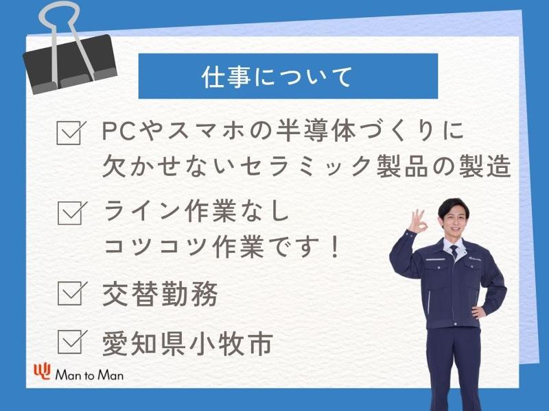 仕事内容: 【職種】 半導体セラミックの製造 【仕事内容】 / 高時給の設定で魅力的な安定した 収入を得ることができます。 月収手取40万円以上可能! \ パソコンやスマホ、ゲームなどに 使用されている半導体を 作る為には欠かせない製品を 製造しています。 成形→加工→組立→検査→洗浄という 流れで生産を行います。 ◇加工作業 機械に素材をセットし、機械加工を 行います。 取り出して検査を行い、 それを繰り返し行います。 ◇組付け・組立 細かな作業です、正確性と集中力が 必要になります。 一見、細かい作業と思われがちですが 難しい作業はございませんので、 すぐにご活躍いただけます! ※配属先は適性を見て決定致します。 ※ライン作業ではございません。 工場見学も随時開催しております。 ご不明点等、いつでもお気軽に お問合せ下さい! 沢山のご応募、お待ちしております。