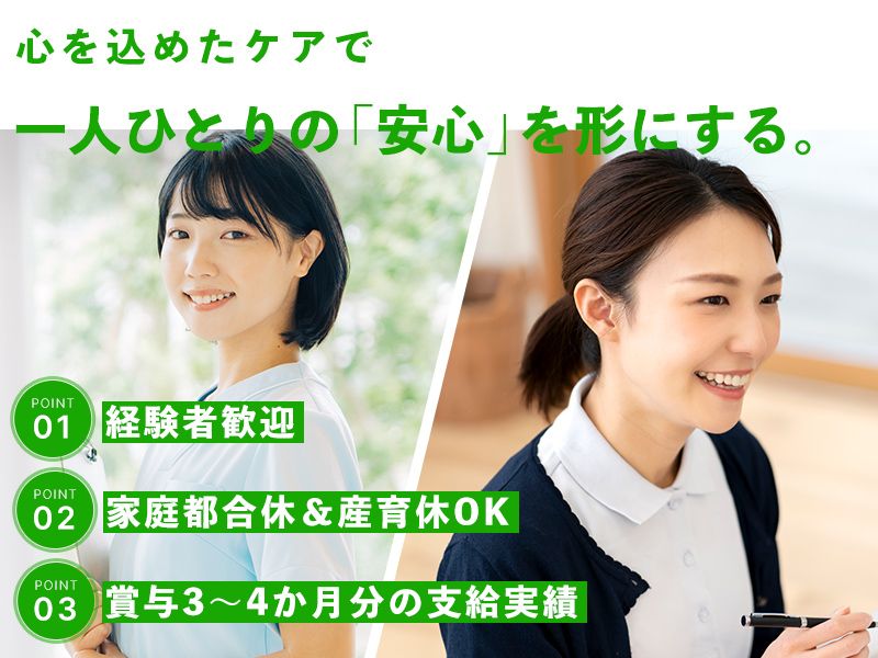 アピールポイント 【1】家庭との両立をサポート! お子様の学校行事や急な体調不良など 家庭都合のお休みも調整します。 産休・育休制度の整備や、 休憩時間中の一時帰宅などご家庭との 両立ができるようサポートします。 【2】やりがいを感じられる安定の待遇! 賞与は年2回支給! 年間3~4か月分の支給実績もあり、 日頃の頑張りをしっかりと還元します。 さらに随時昇給のチャンスもあり! 【3】応募のポイント ●経験者歓迎! ●有資格者歓迎! ●U・Iターン歓迎! ●20代活躍中! ●30代・50代活躍中!