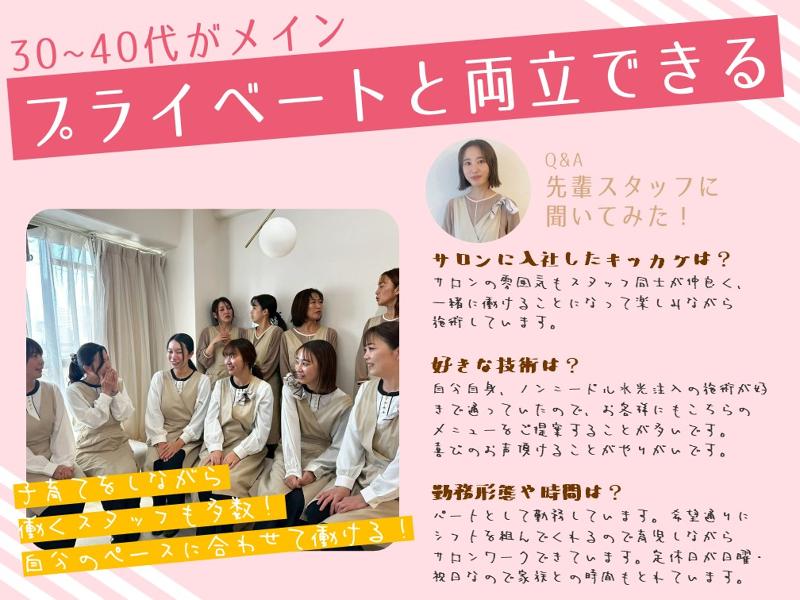 アピールポイント: <アピール① : STAFF First> i'm esteの代表は、過去10年以上にわたり全国3000を超えるサロン様の経営や販促のサポートを行ってきました。 そこで感じたことは「美容業界は、そこで働くスタッフがすべて」だということです。 だからこそ、お客さまへより良い技術やサービスを提供できるよう、スタッフの皆さまが日々楽しくやりがいを持って働ける体制作りを第一に運営しています。 お客さまはもちろん、一緒に働いてくれるスタッフの皆さま一人ひとりを大切に考えるのがi'm esteです。 2025年12月現在、スタッフ数はグループトータルで約400名。アルバイトや時短勤務、産休育休明けのスタッフなど多様な働き方を実現しています。 これからも私たちi'm esteは "STAFF First" であることを皆さまにお約束します。 <アピール② : i'm este Method> NYやロンドンで活躍したヘアメイクアーティストによる研修を実施します。 お客さまに提供するサービスにもこだわります。 i'm esteでは、NYやロンドンで活躍したヘアメイクアーティストが在籍していて、 一人ひとりに研修を実施していきます。