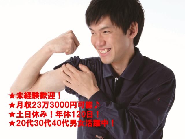 エアコン部品のピッキング・製品の積み下ろし補助作業 身体を動かしたい方にオススメ! 難しい仕事はありません! 未経験から始めていただけます! □未経験歓迎! □嬉しい土日休み! □月収23万3000円以上可能♪ □年間休日120日! □20代~40代までの幅広い男女活躍中! 残業月10~20時間と ほどよい残業のため、稼ぎながら しっかりお休みもとれます♪