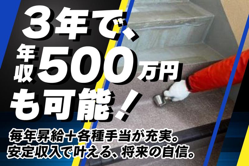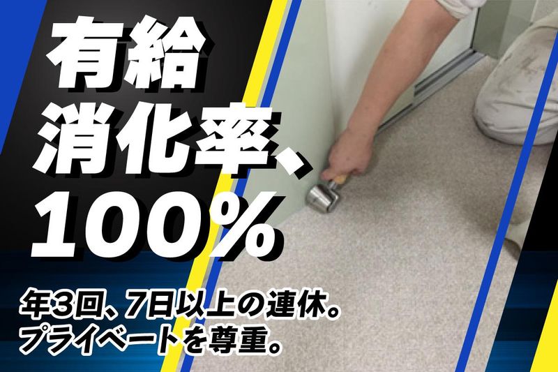 仕事内容 こんなライフスタイルが叶います♪ ◎16時半に作業終了!17時には退勤 ◎有給はしっかり使って 旅行も家族サービスもできる ◎1年目から年収400万円 当社で活躍中の先輩は・・・ 「帰宅が早いのでゲーム三昧です」 「毎日ジムにも通ってます」 そんな声が上がっているのは 当社が働きやすい環境を 積極的に進めてきたからです。 ──────────────── ✅ 求人のポイント ──────────────── *未経験大歓迎! 補助作業からスタート *有給取得率100% *試用期間2ヶ月後は月給25万円以上 *賞与年2回/残業代全額支給 *資格取得支援あり *将来は役職者・管理側への ステップアップも可能 *GW・お盆・年末年始休暇あり 「着実に業務を覚えながら、 ステップアップを目指せる」 「しっかり休んで、 プライベートや家庭も充実する」 「安定した収入で生活基盤を作る」 これらを叶える 環境を用意しています! ──────────────── ✅ 仕事内容 ──────────────── お任せするのは、 マンションやアパートの 廊下・階段・ベランダなどの 床材の張り替え工事。 難しい作業を いきなり任せることはありません。 先輩と一緒に現場へ入り、 道具の扱い方や作業の流れを 少しずつ身につけていける環境です。 【 具体的な作業 】 ◆既存の床材シートの撤去 ◆下地を塗って床面を補修 ◆新しい床材シートの貼り付け ◆仕上げのシーリング作業 ◆片づけや資材運びなどの補助作業 床材の撤去では 専用機械「ペッカー」を使用。 作業は基本2人1組で進めます。 また、大型の現場では 5~6名ほどで対応するため、 周囲への声かけや連携が重要です。 ──────────────── ✅ 資格取得や ステップアップ目指せる ──────────────── 実務で役立つ資格の 取得支援を実施しています。 たとえば 入社後半年~1年を目安に 講習を受けていただく 「職長・安全衛生責任者」は、 取得後は役職手当が付与されます。 (1000円/1日) ──────────────── ✅ ココにも注目! ──────────────── ◆隔週でお休み ◆土曜日に出勤した場合は1.25倍支給 ◆車通勤可/1キロあたり15円支給 ◆交通費全額支給 ◆営業所集合でも現地集合でもOK 有給休暇は取得率100%! 5日間以上の連休取得が可能です。 育児休暇も取得可能です! 安心して休める環境なので、 仕事・プライベートを両立できます。