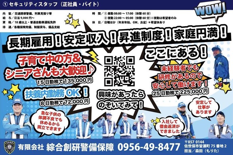 仕事内容 <アピールポイント> ―――――――――――――――――――― ◆日払・週払いOK ◆主婦・元気なシニア・未経験者活躍!! ◆扶養内勤務・週2日~勤務OK!! ☆交通誘導警備・雑踏警備・列車見張り等を メインに現場の「安全」を確保!未経験か らでも研修があるので大丈夫です!現場で も2名体制以上なので安心です! <仕事内容> ―――――――――――――――――――― 建設・工事現場、イベント会場等で、関わる すべての人達に安心と安全を提供します。 【交通誘導警備業務】 国道・県道・市道で、片側通行・歩行者誘 導・通行止め・車線変更や、工事車輌の誘 導等を行います。 【雑踏警備業務】 各種イベント会場において会場内外の安全 を確保します。 【駐車場警備】 ス-パ-・銀行・神社などの、駐車場の出 入口で、お客様の車輌と歩行者・一般車輌 との接触事故防止や、周辺道路の渋滞緩和 に努めます。 <担当者からのメッセージ> ―――――――――――――――――――― 貴方は、「今どのような気持ち」で、お仕事 を探されていますか? 「今までいろんな会社を転々としてきた」 「借金人生から抜け出したい」 「もう親に心配や迷惑をかけたくない」 「こんなダメな自分をかえたい」 「とにかく稼ぎたい」 「人を護る仕事をして、自分を高めたい」 「カッコイイ制服が好きだから」 上記のようにお仕事を探している「環境や理 由」は本当に様々だと思います。 私たち綜合創研警備保障は貴方が描く「希望 の働き方や働く目的」を、叶えられるようサ ポートします。 まずはお気軽にお問い合わせください! <綜合創研警備保障の取り組み> ―――――――――――――――――――― 【SDGsの取り組み①】 主婦の方の扶養内勤務や、シニアの方達の再 雇用に力を入れ、社員が長く働ける職場作り を行なっています。 【SDGsの取り組み②】 社員全員は給与と別に評価制の手当支給があ りますので、性別に関係なく、いつ又何歳で 入社しても、毎月安心して公平な評価(手当 )を受けることが出来ます。 【未来に対する取り組み】 2022年より、AIを活用した交通誘導業務 にも力を入れてます。 上記の取り組みを通して、私たち綜合創研警 備保障はこれまで以上に多くの方に「安心」 をお届けできるよう邁進していきます! 貴方の挑戦(ご応募)お待ちしております!