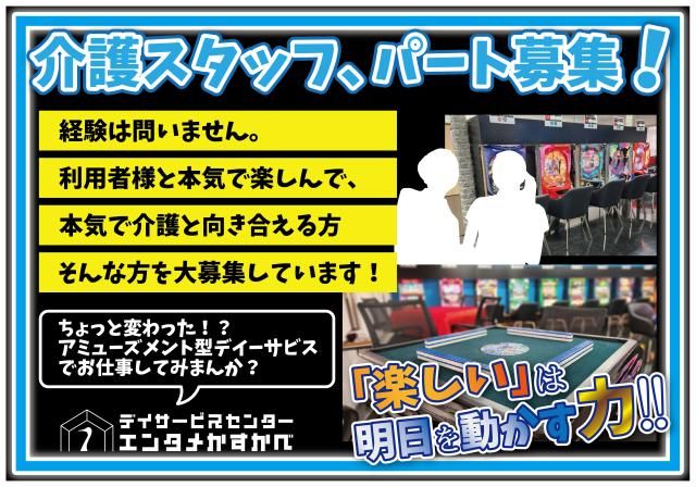 【介護スタッフ/パート】2024年2月にオープンしたアミューズメント系デイサービスで働こう! 介護の未来形を一緒に作っていきませんか! パチンコやパチスロ、麻雀など自分の世界に没頭できる施設づくり…。 実は脳の活性化や身体機能の回復を促す効果があるんです。 現代のお年寄りは、ゲームに興じる方が圧倒的に増えています。 しかし、デイサービスの現状はレクリエーションを開催したりしていますが、 本当に利用者様のニーズに合っているのかという疑問からスタートしました。 今日も行きたい、明日も行きたい、そういう施設を一緒に作ってくれる仲間を求めています。 利用者様だけでなく、皆が幸せに過ごせるように調整してくれるような方と一緒に働けたら嬉しいです!