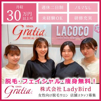 職場環境 【従業員構成】 ・男女人数 女性:1000人 【スタッフの前職例】 エステティシャン/脱毛サロン/セラピスト/ メンズ脱毛サロン/美容クリニック/美容スタッフ/ 美容カウンセラー/アロママッサージ/ネイリスト/ フェイシャルエステサロンスタッフ/ リラクゼーションサロンスタッフ/ ホテルフロント受付/スーパースタッフ/ 医療事務/一般事務/コールセンタースタッフ/ カフェスタッフ/ドラッグストア/カラオケ店員等 *ハローワークで求職中の方も歓迎! *U・Iターン歓迎! *無資格歓迎! 【北海道~沖縄まで日本全国に店舗展開中!】 美容機器・脱毛機メーカーがプロデュースする エステサロン『銀座グラティア』、 脱毛サロン『LACOCO』では、 今後も店舗拡大により オープニングスタッフ募集などの可能性もあり! 駅近5分以内の店舗も多数あり! どのお店も研修制度が充実しているので 安心して始められますよ♪ 【職場の雰囲気】 にぎやかな職場 協調性がある 立ち仕事 アットホーム お客様との対話は多い 初心者活躍中 知識、経験不要