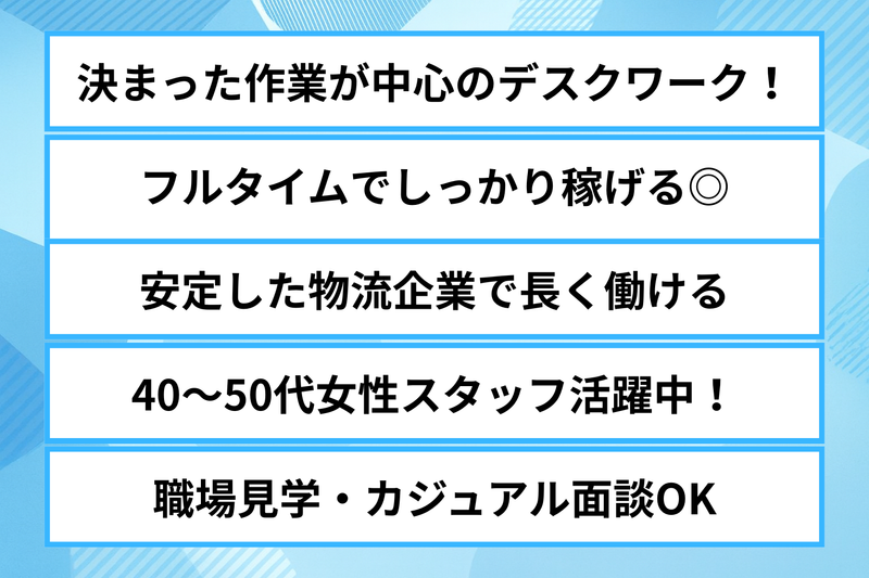求めている人材 【応募条件】 未経験大歓迎! 年齢不問・経験不問! ・Excel、Wordの基本操作ができる方(文字入力ができればOKです!) ・高校卒業以上 ◆このような方は大歓迎! ・決まった作業にコツコツ取り組める方 ・書類整理・データ入力が得意な方 ・子育てが一段落し、仕事復帰を考えている方 ・家庭やプライベートと両立しながら働きたい方 ・周囲とコミュニケーションを取りながら働ける方 ◆応募しやすい条件もそろっています! ・未経験歓迎 ・ブランクOK ・安定して長く働ける職場 ・マイカー通勤可能 ・無料駐車場あり ・ミドル活躍中 ・中高年活躍中 ・30代活躍中 ・40代活躍中 ・50代活躍中 ・職場見学歓迎