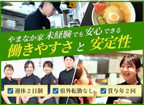 仕事内容 東北の焼肉店で一番の店舗数「やまなか家」で正社員募集! / 元気な挨拶と美味しい料理で お客様を笑顔にするお仕事です♪ \ ★未経験でも安心のスタート 「包丁を握ったことがない」 「接客ははじめて」という方も大歓迎! 先輩スタッフが丁寧に教えますのでご安心ください。 ―――――――――― ■具体的なお仕事内容は? ―――――――――― まずはホール・キッチンの基本業務からスタートします。 ・お客様を席へ案内・オーダー取り・ドリンクづくり・配膳/下膳 ・名物「盛岡冷麺」やビビンバ等の調理、仕込み、盛り付け、食器洗い等 他には、レジ打ち、仕込み業務(お肉や野菜など) ■キャリアステップ 慣れてきたら、発注業務やアルバイトさんの教育 売上管理などの店舗運営スキルも身につきます。 ■頑張りをしっかり評価◎  ̄ ̄ ̄V ̄ ̄ ̄ ̄ ̄ ̄ ̄ ̄ ̄ 入社後は段階的にOJTを受け、スキルアップを実感できます。 コミュニケーション力、調理技術、数値管理、マネジメント… 飲食の現場は「総合職」としての学びが凝縮されています。 また、評価制度もきちんと整備。 定期的な面談を通して「がんばり」が見える化され、キャリアアップや給与反映にもつながります。 ■動画で会社を知ろう  ̄ ̄ ̄V ̄ ̄ ̄ ̄ ̄ ̄ ̄ ̄ ̄ ●KYコーポレーション紹介動画はこちら https://youtu.be/6YBfAui4X2Q/index.html ●リクルート会社情報ページはこちら https://careers.ky-group.jp/index.html ★2月以降の入社もOK!入社日はお気軽にご相談ください! ●スタッフの特色  ̄ ̄ ̄V ̄ ̄ ̄ ̄ ̄ ・平均年齢は37歳! *社員130名のうち、20代が42名/30代が47名と、若手社員が先頭にたち店舗運営をしています★ ・東北出身者が多数、関東からU・Iターンで入社した社員も◎ ・前職も営業、事務、販売員、工場勤務など様々です。みんな未経験からのスタートでした! 包丁の握り方から教えます◎飲食経験ゼロからでも大丈夫です! ●お休みもサポートもしっかり★  ̄ ̄ ̄V ̄ ̄ ̄ ̄ ̄ ̄ ̄ ̄ ̄ ̄ 店舗社員人数はお店の広さにあわせ3名~5名勤務しています。 なので、休みもしっかり回すことができています。平日に連休をとり旅行や推し活に!学校行事のお休みなど プライベートもしっかりとって、仕事に取り組むことができます☆ 研修などサポート体制もバッチリ★ ●新入社員の声  ̄ ̄ ̄V ̄ ̄ ̄ ̄ ̄ お客様の立場で考え、対応することでお客様の笑顔を見られ自身も嬉しく感じます。 「ありがとう」や「美味しかった」と言われるたびに入社して良かったと思います。 お客様の笑顔が私のやりがいです。 食事を楽しむ姿を見ると自分が人の役に立っていると実感し、より喜んでもらおうと頑張ることができます。