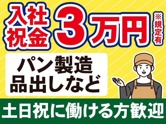 仕事内容 <ポイント> ・入社祝い金3万円プレゼント※規定有 ・日勤&シフト制 ・未経験OKの食品製造 ・20代~50代(中高年)の男女活躍中 ・土日祝の週末に働ける方歓迎! ・給与前払い制度あり <お仕事内容について> 食品スーパーのベーカリー部門スタッフ! 生地の成型といったパン製造や、 袋詰め・品出しなどの陳列作業をお願いします。 ※10kg程の鉄板をオーブンに出し入れする作業あり パン製造スタッフに興味がある。 夕方前のお買い物に便利なスーパーマーケットで働きたい。 そのような方にもオススメ! 働きたい曜日やご家庭の都合など、 お気軽にシフトご相談ください。 職場見学OK お気軽にお問い合わせください <働く環境について> ・髪色自由※規定有 ・休憩室完備 ・個人ロッカー有 ・お店でお昼(弁当など)購入可能 ・作業着貸与 ・未経験者歓迎 <こんな方にもおすすめ> 子育てが落ち着いた世代の皆さん。朝活でお仕事しませんか? 7時からと少し出勤時間は早いですが、フルタイムで働いても終了15:00です! 午後の自由な時間が多いので、家事との両立も可能です。 シフト制でのお休みだから、連続しての勤務もあまりなく、また残業も ほぼありませんので、カラダへの負担も軽く〇