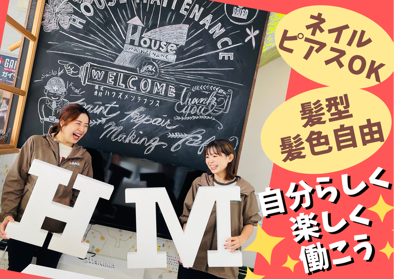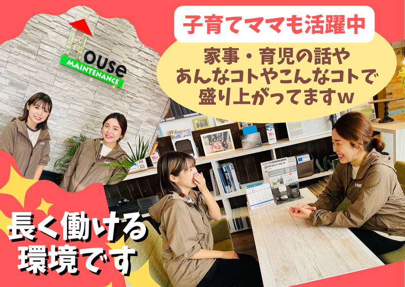 仕事内容 =======ここがおススメ======== ⭐オシャレも楽しみながら働こう(^O^)/ ⭐髪型&髪色自由 ⭐ネイル・ピアスOK ⭐希望シフトでプライベートも充実◎ ======================== 好きを仕事に☆彡 あなたらしく活躍してほしいと思って います(^^♪ <具体的にお願いしたい業務> ・HPの更新 ・SNSの更新 ・Googleマイビジネスの更新 ・チラシ作成 ・展示POPの作成 ・シンデレラ業務 (お掃除ですwww) ・モデル活動 (希望者のみですが広報活動にも力を入れています♪) ・記事作成 (送付書などにお客様ごとに一言添える取り組みもしています) <その他一般事務作業> ・問い合わせ対応⇒営業への引継ぎ ・受注業務、受取 ・定期点検のご案内 ・イベント準備 ・書類作成(請求書や工事の写真帳など) ・備品管理 ・契約管理・工事情報の入力など ・電話応対 ・来客応対 みんなで分担して作業をしているので、 徐々にできることを増やして いきましょう。 あなたの得意分野が活かせればそれでOK♪ どんどん好きを伸ばしていきましょう(^^♪ - ✅研修期間として3か月間、 一宮本店にて勤務していただきます。 ✅会社会議のため、月1程度、 一宮市の会議会場へご参加いただきます。 - 株式会社ハウスメンテナンスは、 総合建築、リフォーム、増改築、 屋根工事、塗装工事、板金工事、その他 住宅工事全般を行う会社です。 一宮市、稲沢市、江南市に店舗を構え 地域の皆様のライフスタイルに合わせた 住宅のリフォームをご提案しています。 ✨先輩スタッフからの一言 - 役職や年次に関係なく、割と誰にでも 話しやすい雰囲気の会社です。 そして女性も長く働きやすい環境です。 正社員で入社し、産休・育休をとり 復帰するスタッフ活躍中! お子さんが小さいウチはパートで働き、 手が離れたらまた正社員に戻って しっかり稼ぐなど、柔軟に 対応しています。お友達や親戚にも 紹介したくなる会社を 目指して職場づくりをしています。 - よろしければ採用サイトもご覧ください。 https://s14cr31i.jbplt.jp/ 企業HP採用特設サイト https://recruit-info.com/138hm/ - ★あま市、弥富市、海津市、愛西市、飛島村から通うスタッフも活躍中! 事業内容 リフォーム事業等