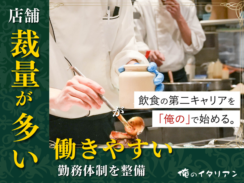 仕事内容 ✅ 次の「俺の」をつくる副料理長候補募集 ✅ 入社半年で料理長昇格実例あり ✅ 店舗ごとの裁量あり ✅ 売上・人件費まで触れる裁量 ✅ 働きやすい勤務体制を整備 ▼仕事内容の概要 俺のイタリアンのキッチン業務全般をお任せします。 前菜・プリモ・セコンドなどの調理を担当しながら、 仕入れや原価意識、オペレーション改善にも段階的に関わっていただきます。 洋食業態での調理経験があれば即戦力として歓迎。 まだ役職経験がなくても、現場を回せる実力があれば次のポジションを視野に入れられる環境です。 ▼<具体的には…> ・前菜、パスタ、メインの調理全般 ・仕込み、食材管理、発注補助 ・ピーク時のポジションコントロール ・限定メニューの提案 ・後輩指導、オペレーション改善 <⭐【料理長が見えるポジション】> まずは得意なポジションからスタート。 プリモ、セコンドを安定して回せるようになれば、厨房全体の流れを見る立場へと役割を広げます。 実際に入社半年で料理長へ昇格した社員もいます。 役職は年齢ではなく、現場での安定感と判断力で決まります。「上が空くまで待つ」構造ではありません。 <⭐【裁量のある厨房設計】> グランドメニューはありますが、季節食材を使った限定メニューは各店舗で企画します。 提案が通れば、あなたの一皿がそのまま商品になります。 仕込み量の調整やオペレーション改善も、現場判断が基本。 ただ“回す”だけでなく、“良くする”立場を目指せます。 <⭐【昇格後の給与が明確】> 月給30万円〜40万円スタート。 店長昇格時は月給42万円以上。 年収モデル ・30代店長:540万円 ・40代SV:720万円 業績賞与は年4回。 入社1年目から支給対象です。 売上改善や原価コントロールなど、 店舗への貢献は給与や賞与に反映します。 <⭐【働きやすい勤務体制を整備】> 月8~9日休み、年間休日105日。 半休+有給取得も可能で、土日の希望休も相談できます。 終電時間は必ず考慮。 固定残業45時間を超えた分は1分単位で全額支給します。 「飲食は休めない」 そんな前提で働く環境ではありません。 ー ✅俺のブランド、次のフェーズへ。 ー 高級食材を手頃な価格で提供する 「俺の」ブランド。 料理人の技術とサービスを強みに 成長してきました。 いま私たちは、 職人文化の良さを残しながら 店舗運営やマネジメントを見直す 新しいフェーズに入っています。 次の「俺の」をつくるため、 この変化を一緒に進めていく 副店長候補を募集しています。