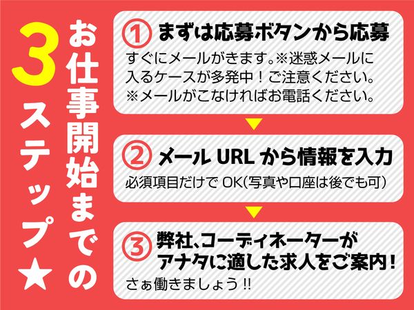 選考フロー >>スグ働きたい方はWEB登録がおすすめです♪ ◆下記URLよりご登録ください。 https://jobs.technologies-group.co.jp/commissions/company_view/661 仮登録完了は下記のアドレスから送信します asqst@a-square.ne.jp ※迷惑メールに入るケースが起きています。お気をつけください。 ご応募いただきましたら2営業日までにはこちらから折り返し ご連絡いたしますので、よろしくお願いいたします。 【連絡先:06-6485-9977】 長期勤務のみのご紹介となります。 それでは、ご返信をお待ちしております。 よろしくお願いいたします。