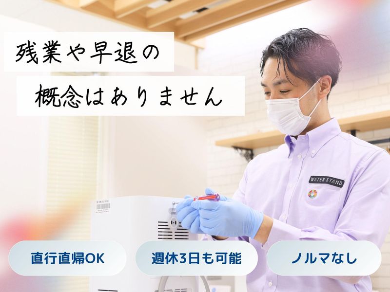 仕事内容 / 働き方の概念が変わる!? ストレスフリーで 自由な働き方を.・☆* \ . 業績好調!! 営業スタッフ増員募集♪ . ================= この求人のポイント♪ ================= ◆経験・スキル不問! <普通免許があればOK>です☆ ◆年間休日<120日以上!> ◆未経験も安心の<サポート体制完備♪> ◆<スーパーフレックス制>で 理想の働き方が実現♪ ◆ノルマはありません!! . . ================= 仕事内容はこちら! ================= . ✅サーバーメンテナンス  ̄ ̄ ̄ ̄ ̄ ̄ ̄ ̄ ̄ ̄ ̄ ̄ フィルター交換や作動チェックなど 既存のお客様先にて メンテナンスを行います! 1件40分ほどの時間が掛かるので お客様とのお話しを楽しみながら 作業をお願いします♪ 設置から修理まで、やり方は 研修でしっかりレクチャー! . ✅新規顧客対応  ̄ ̄ ̄ ̄ ̄ ̄ ̄ ̄ 電話やSNSからお問合せいただいた 新期のお客様先にて、 お客様の要望をヒアリングし 最適な機種のご案内を行います! . ✅設置・交換・撤去  ̄ ̄ ̄ ̄ ̄ ̄ ̄ ̄ ̄ ̄ ご契約されたお客様先にて ウォータースタンドの設置を行います! . . もちろん、 社用車や制服 タブレットや携帯電話などの 業務に必要なものは貸与! 設置方法や お手入れ方法のご説明などは 入社後にしっかり研修を行うので どなたもご安心くださいね♪ . . ================= 安心の<サポート体制!> ================= ◆入社後、まずは座学研修で 商品知識や訪問マナーなどを 基礎から丁寧にレクチャーします! . ◆座学研修後は、OJT研修で 先輩に同行し実際の現場を 学んでいただきます! . ◆独り立ち後も 階層別の勉強会や研修を実施♪ . 更に・・ 週に一度、 上長との面談を設けています。 ◎実務上のトラブル解決方法 ◎アドバイス・フォロー などなど・・ 些細なことから 相談できる環境が整っています♪ 安心してご応募ください☆ . . ============== <直行直帰>可能! ============== ご自宅から直接 お客様先へ訪問をし、 そのまま直帰OK! 勤務時間や休日は 自分で決められるので 週休3日の働き方も◎ フレックスタイム制ならではの 働き方が実現可能です♪ あなたが「働きやすい!」と思える ワークライフを見つけていきましょう! . . ============== 1日のスケジュール例 ============== 9時 自宅から出発! メンテナンスで3件訪問 12時 ランチタイム♪ 13時 新規のお客様先へ! しっかりヒアリングし、 お客様に合った機種をご案内♪ 15時 設置作業で2件訪問 17時 自宅へ直帰♪お疲れ様でした! . あるスタッフの1日の例ですが 上記のような働き方が可能です♪ . . =============== ウォータースタンドについて =============== 当社は、 「 2030年までに日本の 使い捨てプラスチックボトルを 30億本減らします。 」 というミッションを掲げ マイボトルを携帯する 新しい文化を創り、 気候変動とプラスチックによる 環境問題改善に取り組んでいます! . 一般のお客様だけでなく 官公庁や公共施設、 企業などのお客様からも 幅広く支持いただいております♪ このような信頼のもと 事業は右肩上がりで成長中! . ☆SNSでも話題のウォータースタンド☆  ̄ ̄ ̄ ̄ ̄ ̄ ̄ ̄ ̄ ̄ ̄ ̄ ̄ ̄ ̄ ̄ ̄ ̄ . // あなたのご応募を お待ちしております! \\