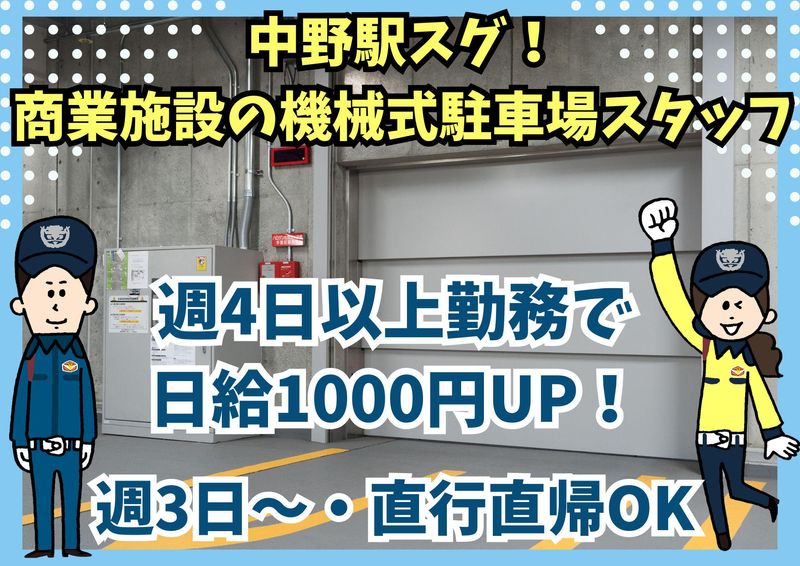 仕事内容 中野駅すぐの商業施設で、機械式駐車場の安全管理・お客様の誘導などをお願いします。 具体的には ・お客様の車両を安全に機械式駐車場へ誘導 ・機械の操作盤を操作し、車両を格納・出庫 ・お客様へ操作方法や注意事項を説明 ・駐車場内の安全管理 などをお任せします。 未経験の方でも、充実した研修で丁寧に指導しますのでご安心ください! ***働きやすさのポイント5つ*** (1)誘導の時間・休憩の時間が交互にあるので、無理なく働ける! (2)どのような状況下でも求められるお仕事なので長期安定! (3)直行直帰OK!家から通いやすい!仕事終わりのお買い物にも便利◎ (4)週払いOK+現場が早く終わっても日給保証あり!