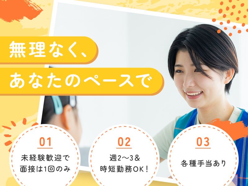 アピールポイント ✨ムリなくSTEPアップ ・・・・・・・・・・・・・・・・・・・・・・・・・・・ 最初は遊びの見守り中心。 専門的な計画作成は、 慣れてから順を追って指導します。 ✨短時間×週2日OK ・・・・・・・・・・・・・・・・・・・・・・・・・・・ 週2~3日、1日4時間~勤務。 残業なしで家庭と両立。 夏休みは日中シフトも可能です。 ✨人間関係が穏やか ・・・・・・・・・・・・・・・・・・・・・・・・・・・ 20~60代まで幅広く在籍。 声をかけ合える雰囲気で、 相談しやすい職場環境です。 ✨送迎も安心体制 ・・・・・・・・・・・・・・・・・・・・・・・・・・・ 最初は必ず先輩が同乗。 2人1組で無理なく対応。 バックモニター付き車両です。 免許なしの方は送迎なし。