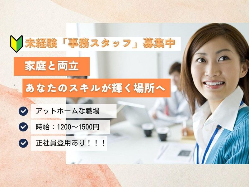 仕事内容 ーおすすめポイントー ■定時退社でプライベート両立♪ ■未経験歓迎! ■安定して長く働ける会社 ■人柄を一番に考えた選考♪ ■家庭の事情に応じて勤務時間対応可能♪ ■正社員登用あり! ー \少人数でアットホームな職場環境/ 事務スタッフとして主に下記の業務をお任せします。 ■来客対応 ■請求書、領収書の作成業務など 分からないことがあればすぐに相談できるため、未経験の方でも安心して下さい♪ これまでの経験やスキルを活かして、働きたい方やワークライフバランスを大切にしたい方にもピッタリです! ー ◇基本毎日定時退社!安心して働ける環境◇ ー ご家庭の事情に合わせて勤務時間についても相談可能なので 子育てとも両立できる環境です。 将来社員として働きたい方にもオススメです! 慣れるまでは先輩が丁寧に教えるので、 安心してご応募ください。