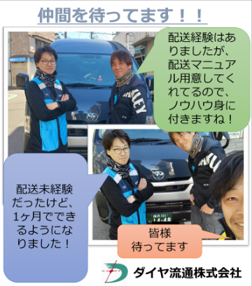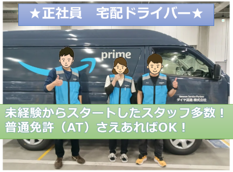 仕事内容 宅配ドライバー 正社員募集! ★ 月給32〜40万円!高収入 ★ **普通免許があればOK!**未経験でも安心の研修制度あり! ★ 1tバン車での宅配業務(EC大手企業の配達) ★Amazonオフィシャル配送サービスパートナー(DSP)ですので、お仕事安定しています! 【☆一日の流れ☆】 7:00 出勤&点呼 7:30 配送スタート! 12:00 休憩1時間 16:00 午後の配送 18時くらいには 帰庫&業務終了 ☆彡仕事はアプリの指示に従って、配送をしていきます!スマホも会社からもちろん貸与です! 1日おおよそ200個~近く配達しますが、皆さん慣れれば問題なく配達できます! とうぜん配達が遅れることがあれば、社員間で応援に入りますので、チームワークで経験を積んでいってください! ・基本は置配がメインです!(全体の90%程度) ・車は1tバン車両に載って配送します!普通免許(AT)があれば問題ございません! ◎ こんな方にオススメ! ・ 車の運転が好きな方 ・ しっかり稼ぎたい方 ・ 安定した正社員で働きたい方